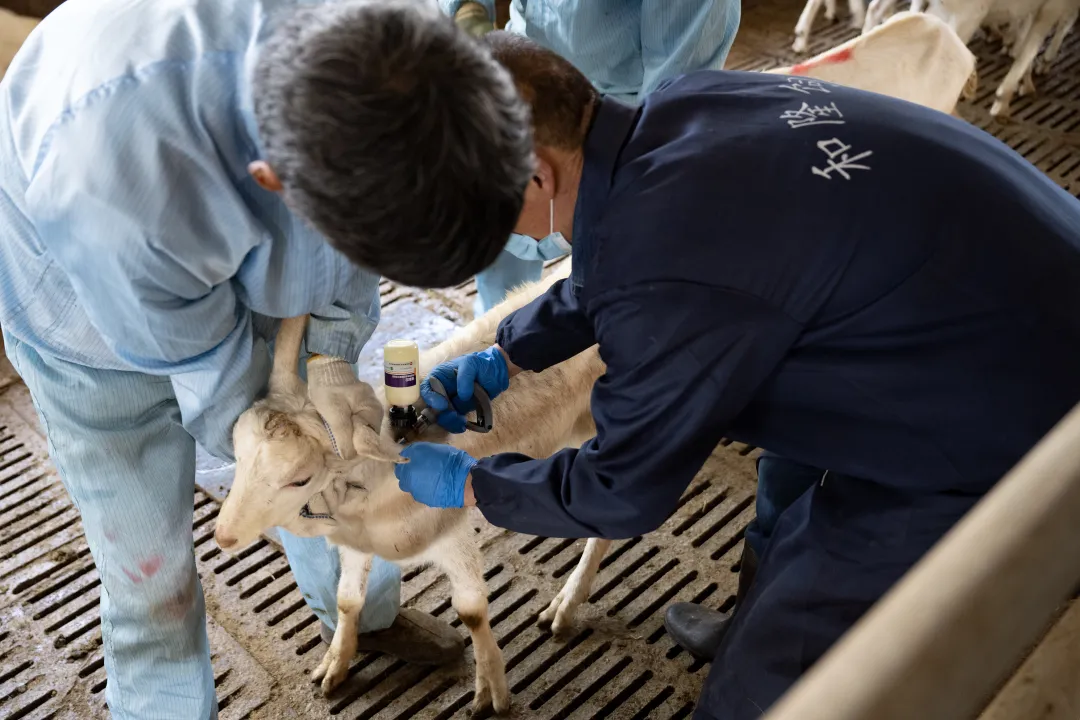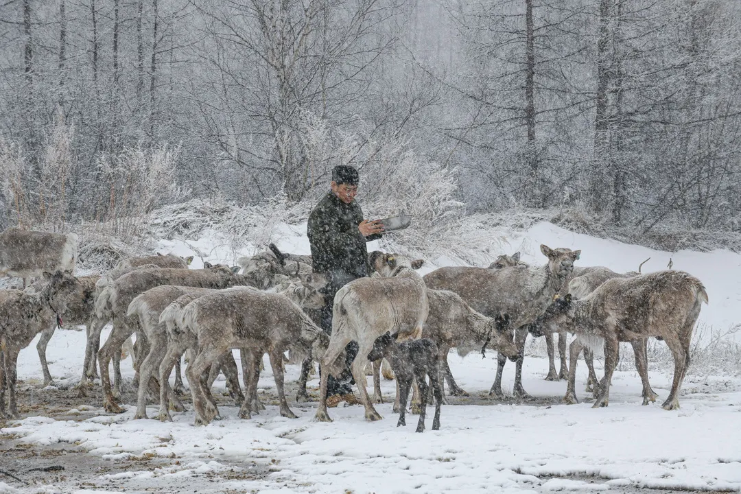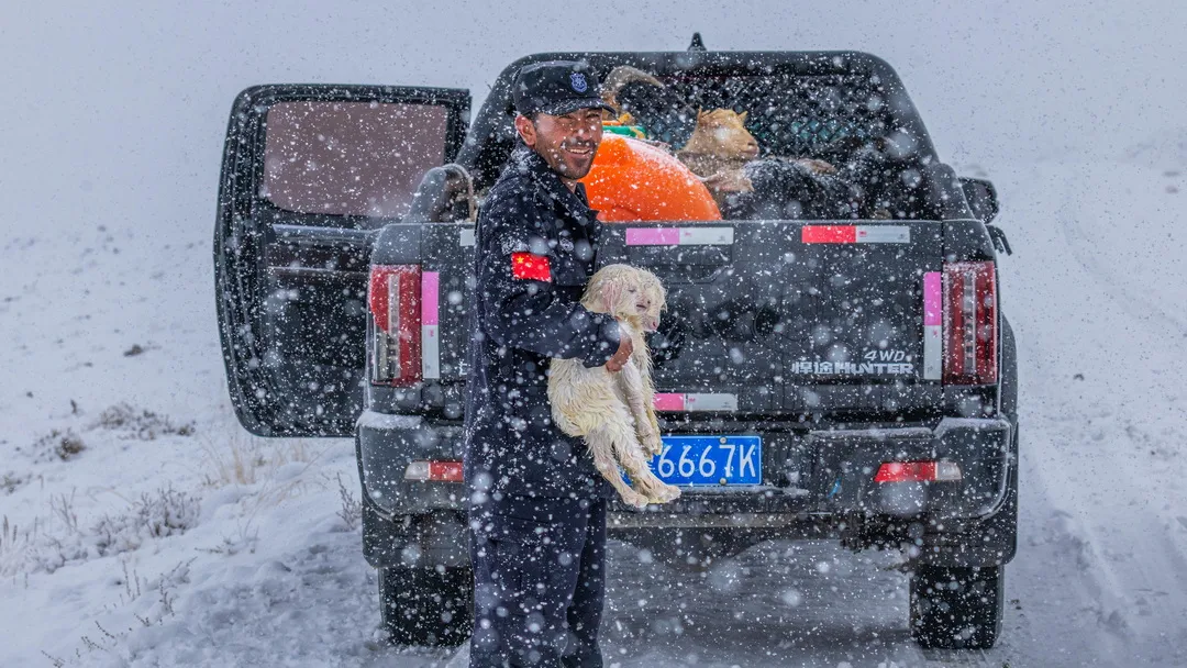 2024年10月28日,新疆维吾尔自治区塔县,护边员在大雪纷飞的天气寻找到当地牧民家一只走散的母羊和诞生不久的小羊羔。