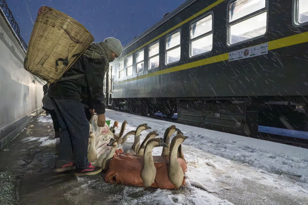 2025年1月26日,四川省凉山彝族自治州,一位村民带着自家养的家禽,准备乘坐慢火车去城里售卖。