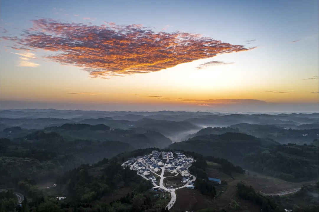 2023年7月5日,四川省乐至县马家井村,天际朝霞似一只璀璨的金凤凰,唤醒屋舍与山峦。