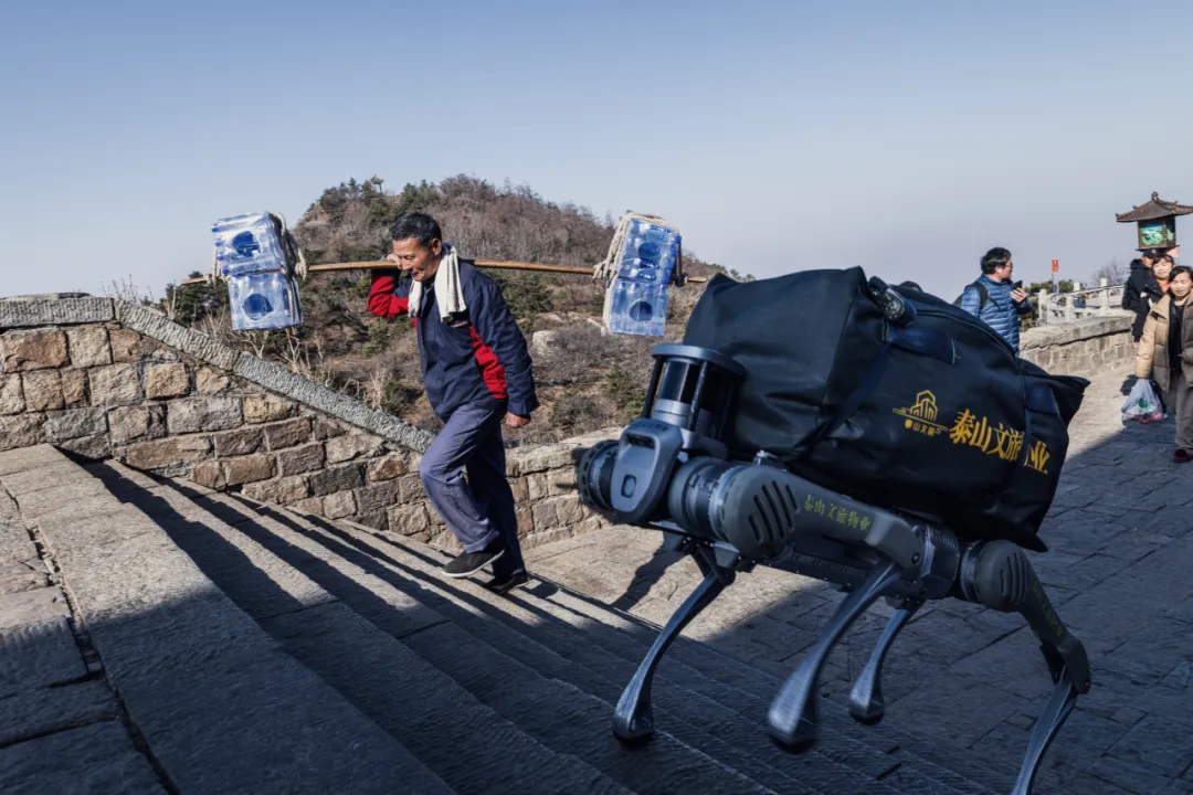 2025年4月1日,泰山天街,泰山挑山工与机器狗并肩前行。