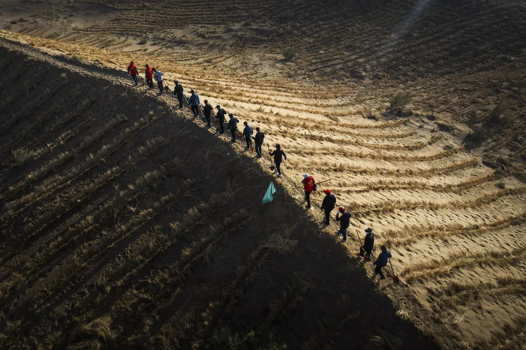 2021年10月11日,凉州区腾格里沙漠,治沙现场。