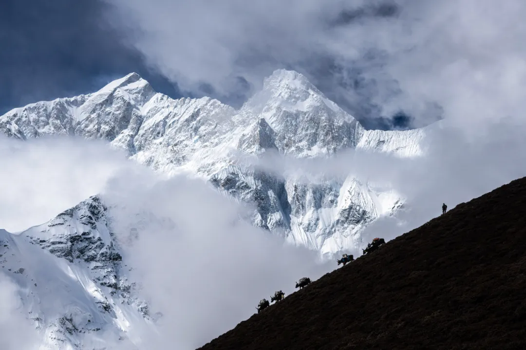 2023年5月28日,西藏定日,行走在海拔7804米珠穆朗卓雪山前的牦牛队。