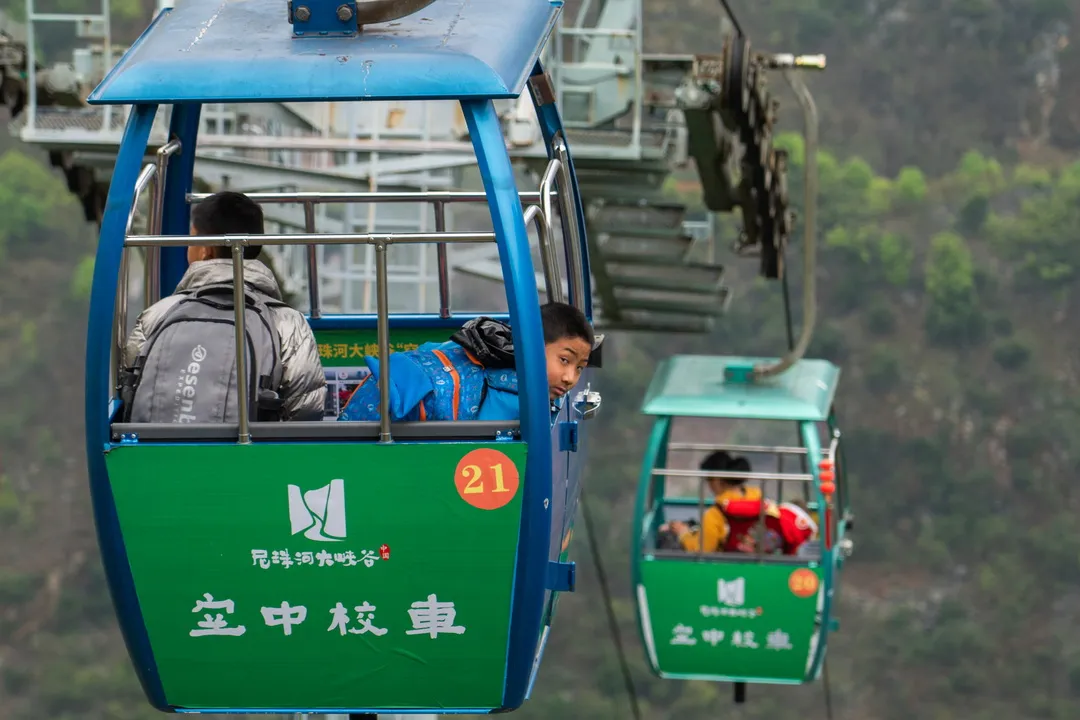 2025年4月2日,尼珠河村的小学生们乘坐索道缆车。