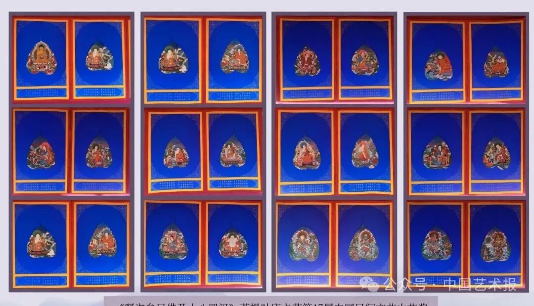 【作品介绍】《释迦牟尼佛及十八罗汉》是以叶形规整、叶脉匀净的优质菩提叶为载体创作的唐卡力作。作品依托叶片天然肌理顺势立意,娴熟运用化隆宗喀白日光唐卡铁线勾描、分层积染、沥粉描金、点瞳开眼等核心技法,尽显这一流派的技艺精髓。该作品创作灵感源自汉藏文化交融共生的千年文脉,以释迦牟尼佛及十八罗汉为核心造像,巧妙融入雪域高原圣境意象,既恪守唐卡法相庄严的神圣特质,又兼得菩提叶的自然灵韵,彰显化隆宗喀白日光唐卡兼容诸家画派、吸纳汉地审美意趣的多元特质。