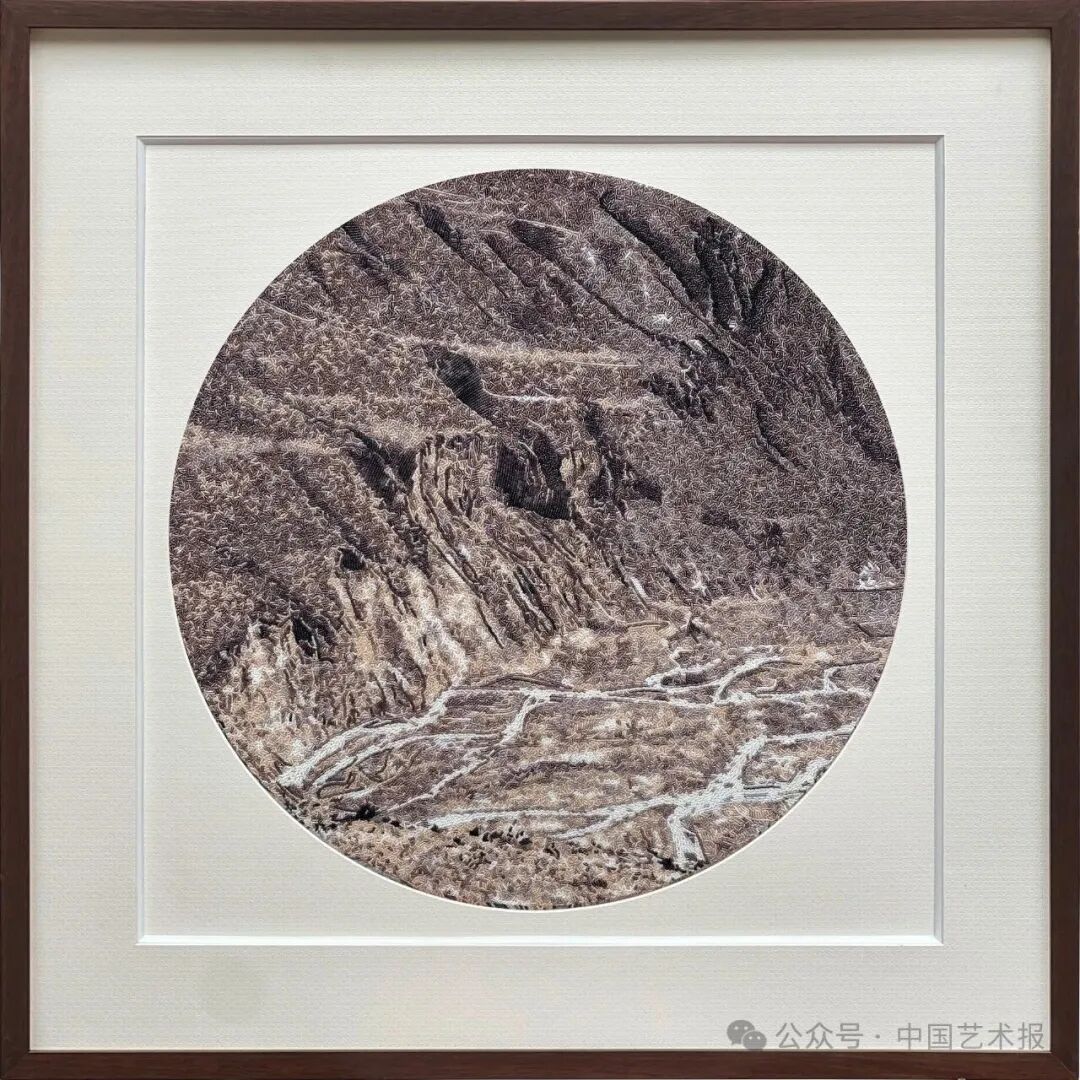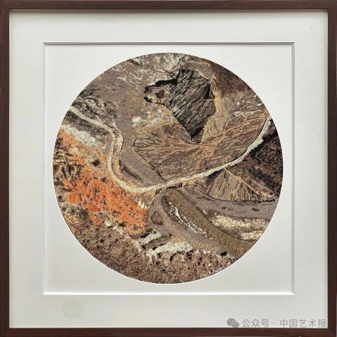 【作品介绍】《峡谷奇光》以粤绣(珠绣)为载体,运用细密匀净的珠粒,通过色阶的细腻过渡与针法的灵活层叠,再现了新疆大峡谷岩壁的天然肌理与光色流动。作品远观如凝视峡谷断壁,色块浑然而富有张力,近察则见细密珠子缀连成序,在光线流转间隐约闪烁。传统珠绣技艺在此不仅是记录自然形貌的手段,更成为能让人产生震慑感的视觉语言。