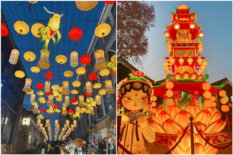 “赏花灯,是我们老秦淮的传统年俗”,市民王先生笑着说,“我本身是个老戏迷,特意带小孙女来熙南里,就是想让她现场感受‘戏曲+花灯’的传统年味。”作为熙南里新春年味的“重头戏”,大板巷巷口一座十米高的“熙南有戏”灯组引得游人纷纷驻足。莲花底座托起六层宝塔,塔身更是暗藏“玄机”——《牡丹亭》《西厢记》的经典人物与桥段齐齐亮相,流光溢彩间尽是戏曲风雅。