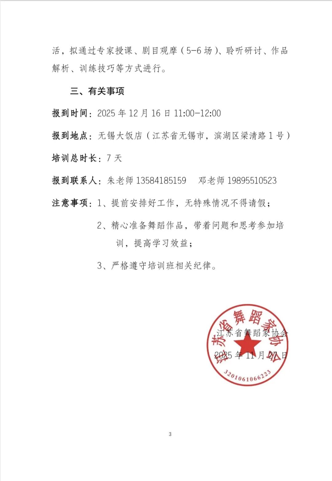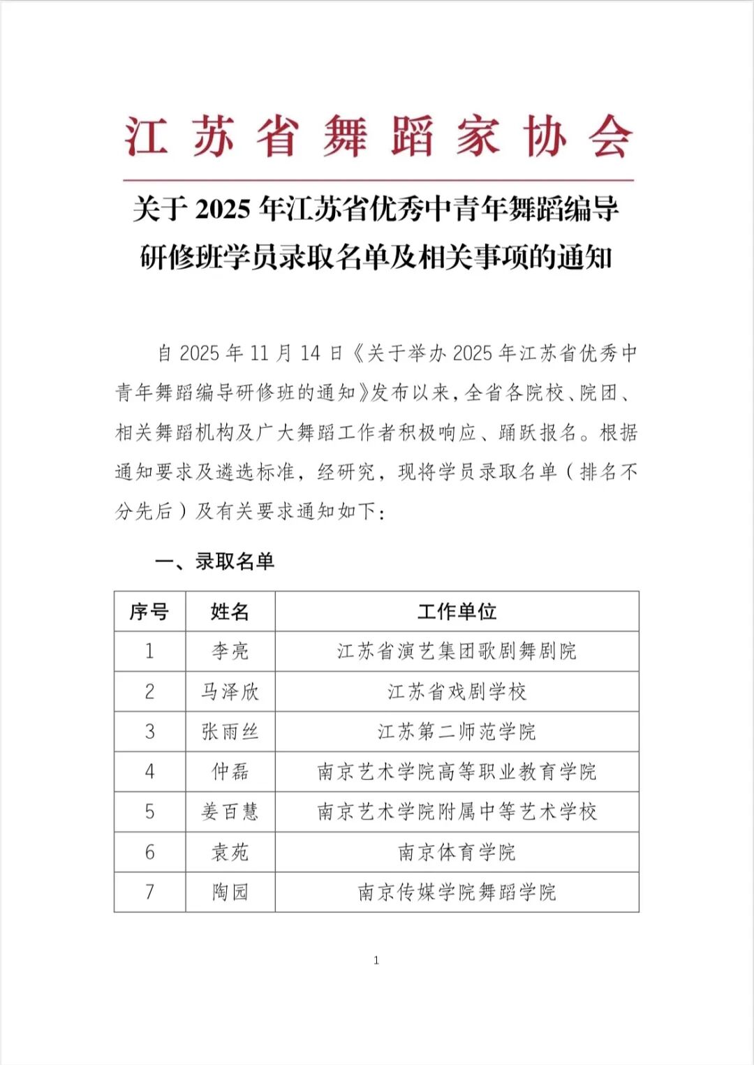 关于2025年江苏省优秀中青年舞蹈编导研修班学员录取名单及相关事项的通知