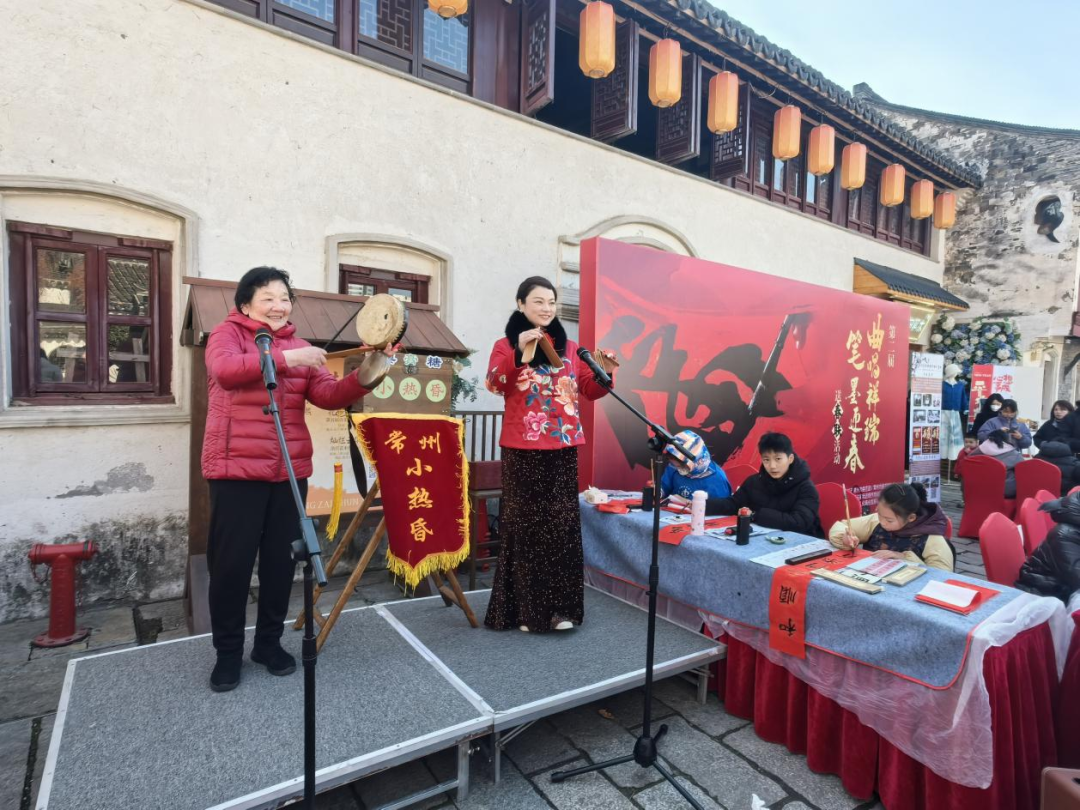 活动现场,有诙谐欢快的常州小热昏,有莺声呖呖的苏州评弹,市曲协会员用精湛的技艺演绎着老常州的年味。演出同时,一群来自中国书法家武进创作培训基地的小书法家挥毫泼墨,一张张福字和春联赠予现场的观众。