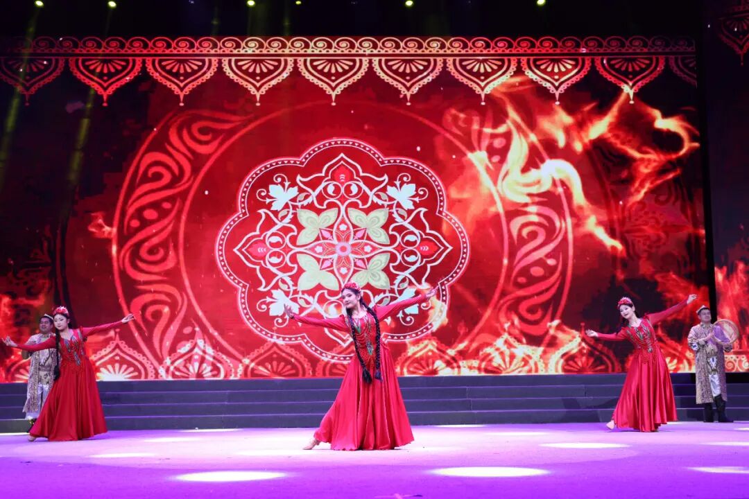 开幕式展演精彩纷呈,节目编排巧妙融合地域特色,为现场观众带来了一场兼具视觉冲击与情感共鸣的文化盛宴。舞蹈《丝路花香》率先登场,以灵动曼妙的舞姿生动勾勒出“一带一路”倡议下跨地域文化交融的鲜活图景,让观众在光影流转间感受丝路文明的源远流长;新疆舞蹈《欢庆》热情奔放的节奏、舒展大气的舞姿,将伊犁草原的辽阔壮美与草原儿女的豪爽洒脱展现得淋漓尽致,仿佛将观众直接带到了苍茫辽阔的天山脚下;《新疆麦西来普》更是点燃全场热情,演员们走下舞台与观众互动共舞,台上台下融为一体,欢声笑语不断,将晚会气氛推向高潮。