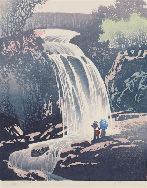黄丕谟 《石梁飞瀑》 套色木刻 56cm×45cm 1980 南京美术馆馆藏