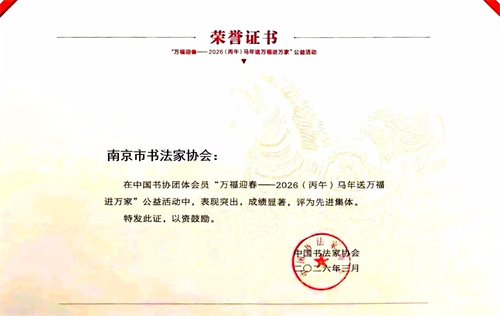 近日,中国书协发布关于表彰“万福迎春——2026(丙午)马年送万福进万家”公益活动优秀团体会员、先进集体和先进个人的决定,南京市书法家协会继2025年后再度荣获2026年中国书协“万福迎春”公益活动先进集体。