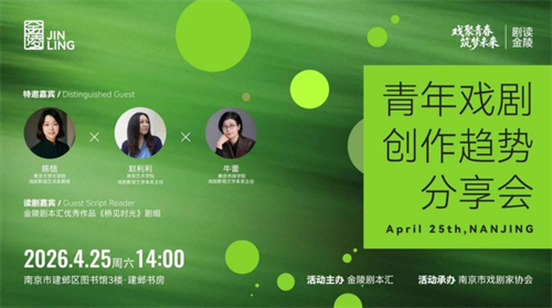 4月25日下午,由“金陵剧本汇”与“戏剧青春·筑梦未来”联合打造的“剧读金陵——青年戏剧创作趋势分享会”在南京市建邺区图书馆举办。本次活动特邀文学博士、南京大学文学院戏剧影视艺术系教授陈恬老师,南京艺术学院戏剧影视文学系系主任、副教授赵利利老师以及南京传媒学院戏剧影视文学系系主任、教授牛蕾老师,聚焦青年戏剧创作现状、趋势困境与破局之路展开深度分享。更有2025“金陵剧本汇”优秀作品《桥见时光》的精彩读剧演出,为现场观众带来一场兼具思想深度与艺术温度的戏剧盛宴。