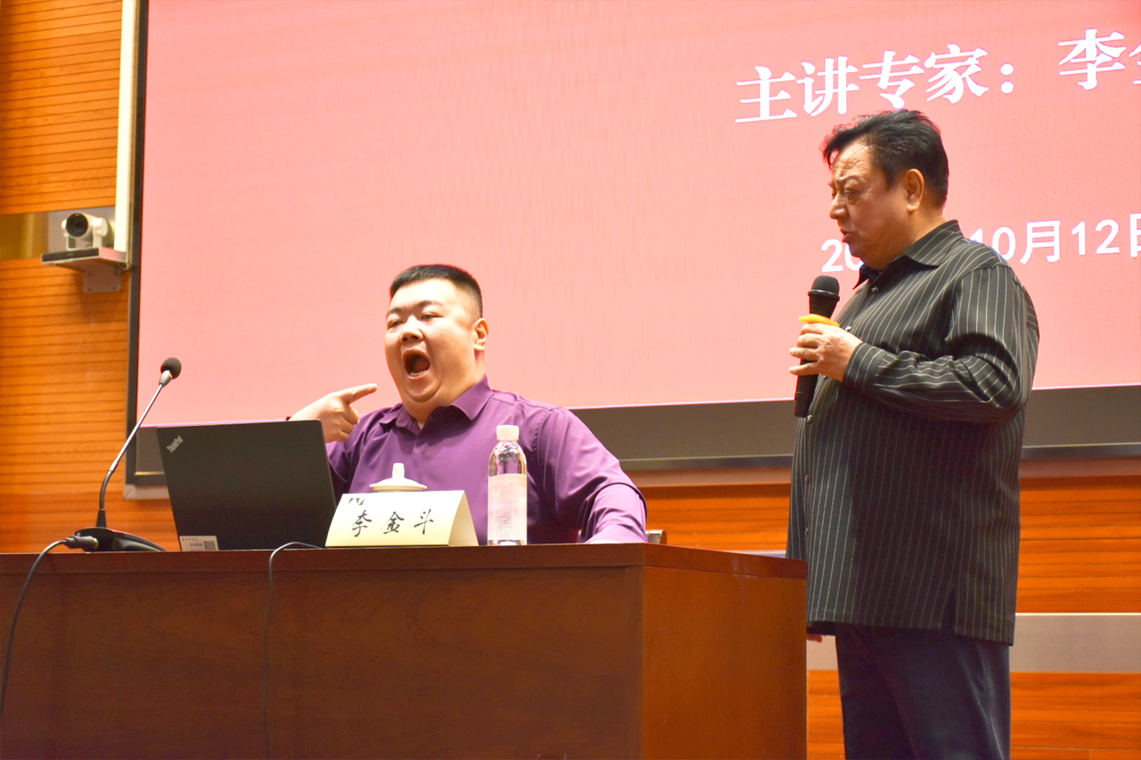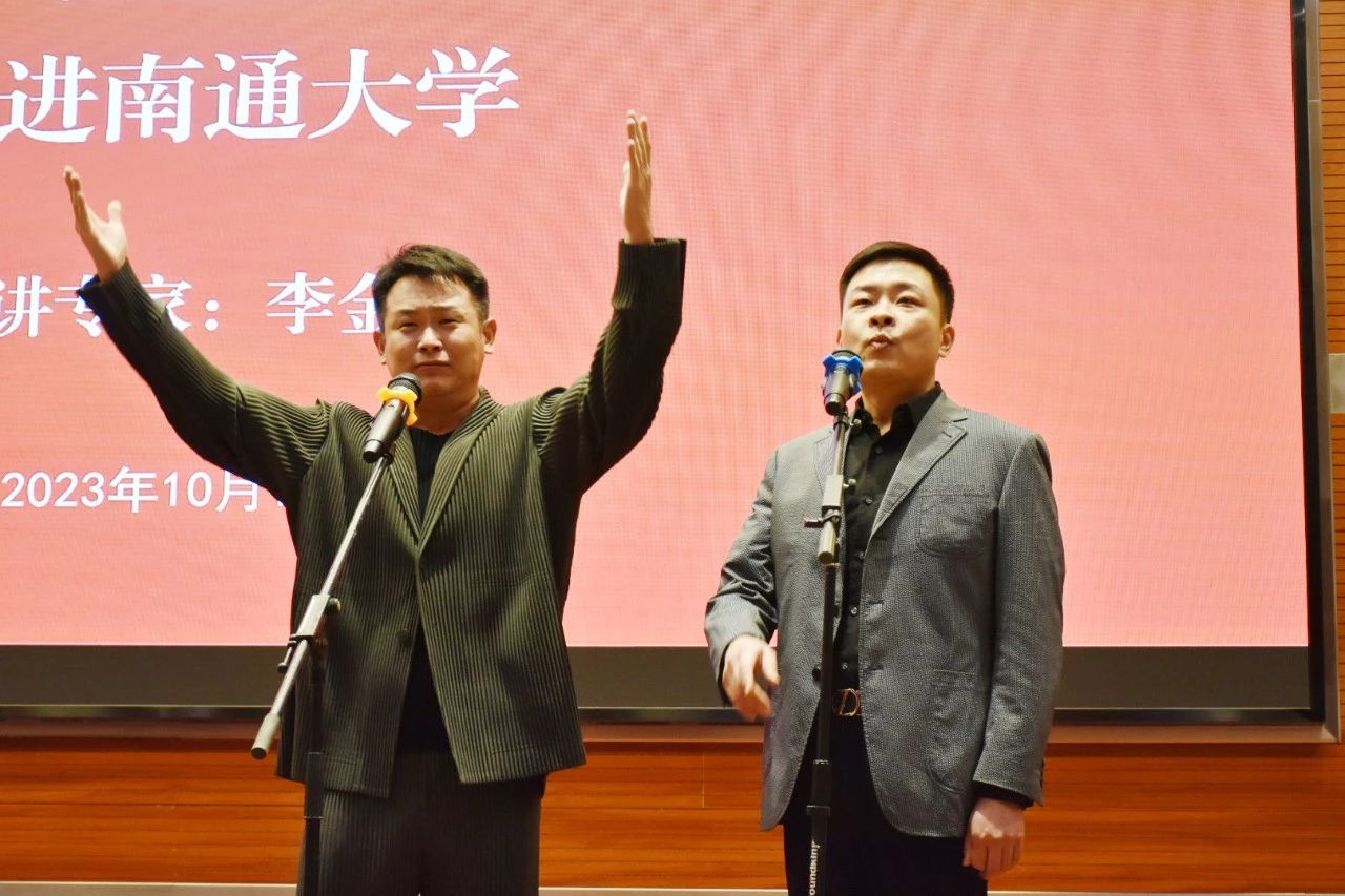 12日晚,中国曲协“曲艺名家进校园”走进南通大学,李金斗给师生们带来了一场知识性与趣味性兼具的讲座。南通大学党委常委、副校长施佺致辞,南通大学艺术学院院长张卫主持。李金斗回顾了自己是如何走上从艺之路和60余年艺术生涯的感悟,介绍了相声艺术的基本常识,并在讲到相应相声技巧时,穿插表演贯口、北京叫卖、京剧、方言等,以及和徒弟万宇演了双簧小段,生动幽默的讲解、精彩即兴的表演,将“以说为主、以学为先、逗在其中”的相声精髓深入浅出地传递给了大家。讲座现场,还有来自中国铁路文工团的梁洪昊、杨凯示范表演相声《都挺好》,两位爱好相声的南通大学学生表演李金斗的早年作品《老鼠密语》,更添热烈气氛。整场讲座有趣有料、寓教于乐,笑声掌声不停,一个半小时让师生们觉得意犹未尽。