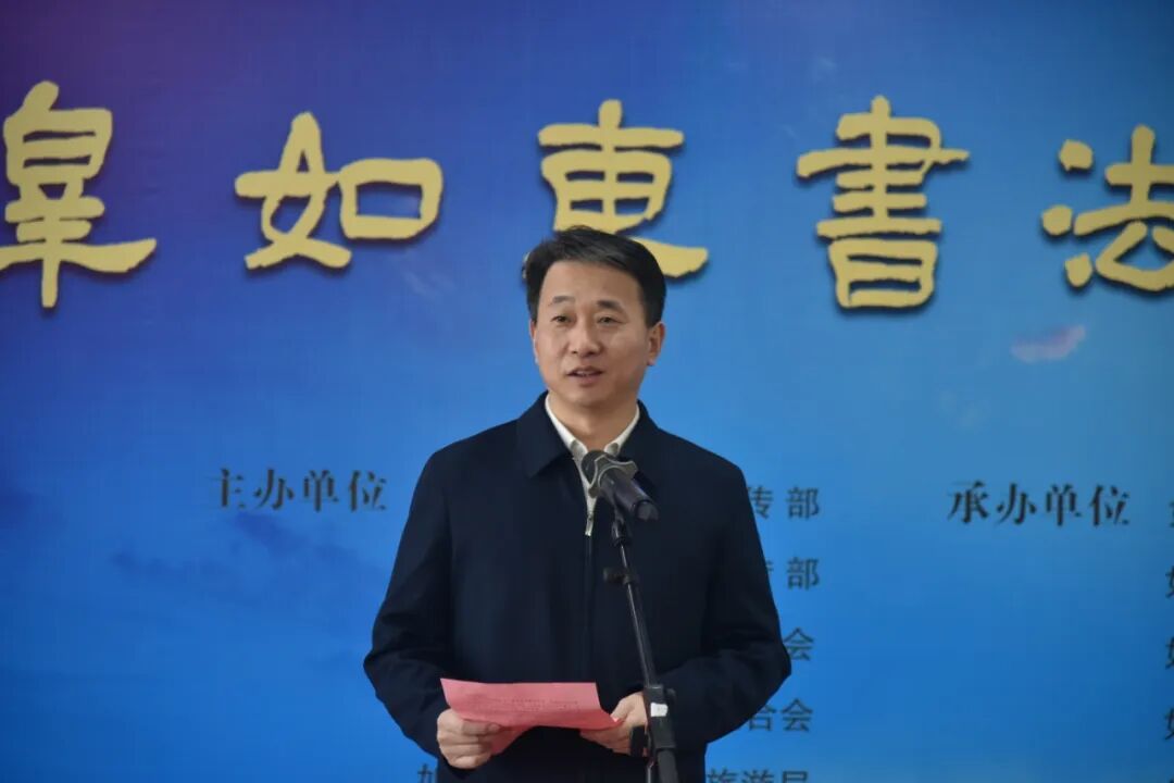 如东县委常委、宣传部部长、统战部部长吴海军致辞。他希望广大书法家和爱好者继续扎根传统、勇于创新,紧跟时代步伐,创作出更多思想精深、艺术精湛、制作精良的优秀作品,用手中的笔墨热情讴歌伟大的时代,描绘美好的生活,书写高质量发展的新篇章;希望两地不断拓展合作广度和深度,探索建立更加常态化、机制化的交流合作模式,实现资源共享、优势互补。