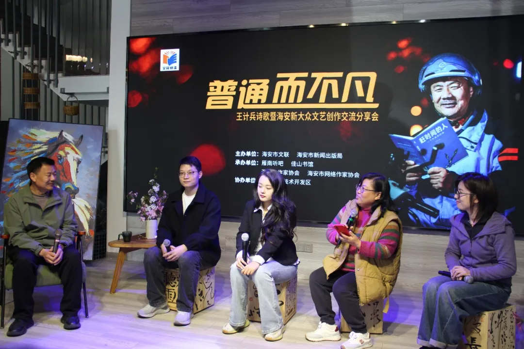 4月7日上午,“王计兵诗歌暨海安新大众文艺创作交流分享会”在海安523文化产业园雁南听吧落幕。“外卖诗人”王计兵与海安新大众文艺代表齐聚现场,共话新大众文艺的诗意扎根。