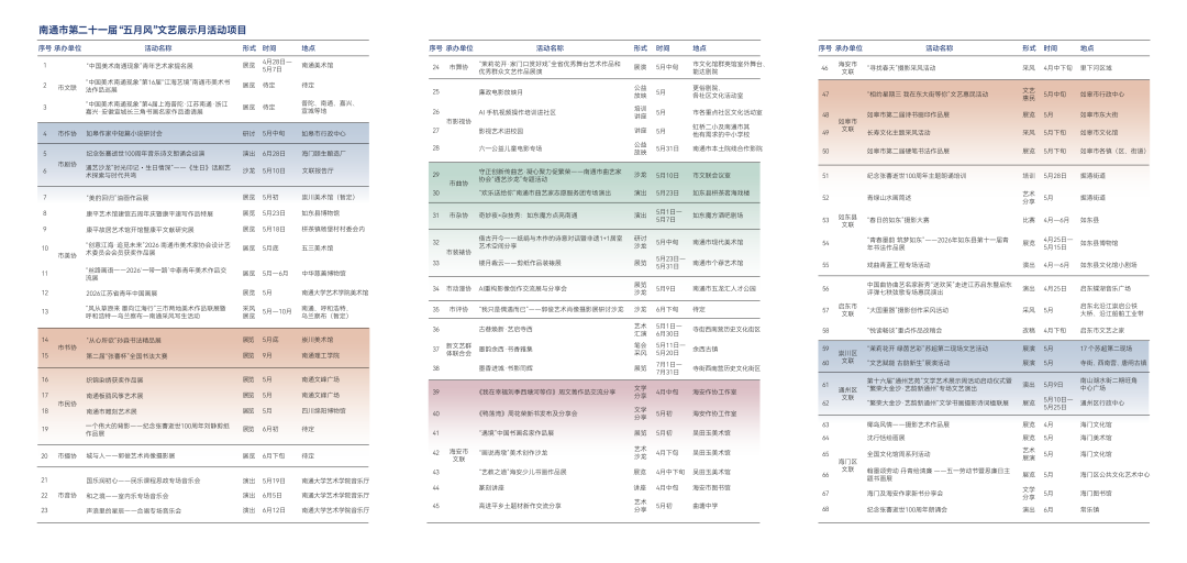 本届“五月风”文艺展示月由南通市委宣传部、南通市文化广电和旅游局、南通市文学艺术界联合会主办,以“出作品、出人才、文艺惠民”为宗旨,深度融合“中国美术南通现象”品牌建设与张謇先生逝世100周年纪念主题,整合全市15个文艺家协会、7个县(市)区文联力量,精心策划68项文艺活动。活动涵盖25场精品展览、13场优秀剧目展演、13场文艺沙龙创作探讨活动、10场送文艺“种”文艺惠民活动、2场新人新作选拔比赛及3场笔会采风等板块,全方位展现南通文艺创作实力,将在整个五月为市民打造一场场高品质、接地气、暖人心的文化盛宴。