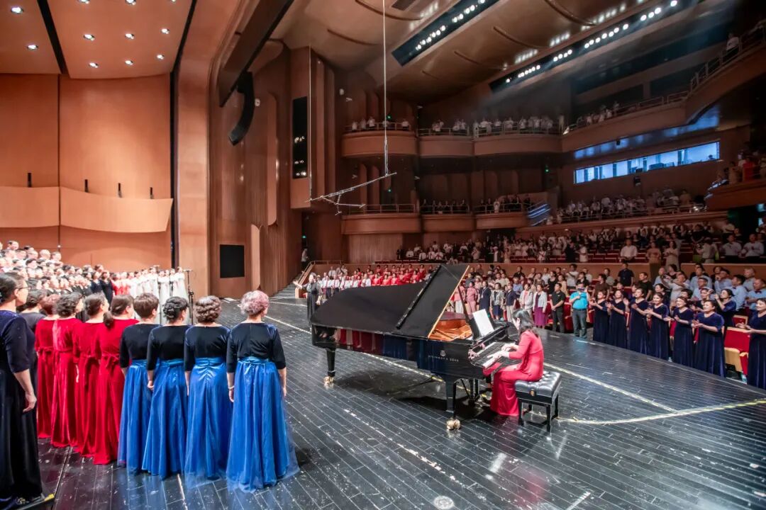 音乐会演出曲目涵盖《松花江上》《我和我的祖国》《保卫黄河》《天耀中华》等二十首经典与原创作品,充分展现了合唱艺术的独特魅力和蓬勃活力。演出最后,所有参演合唱团与现场观众全体起立,共同高唱《歌唱祖国》,将现场气氛推向最高潮。