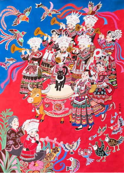 作品入选2026年“新生活·新风尚·新年画”美术作品展览。画中苗族男女身着盛装,神情欢愉自信,吹响幸福唢呐,尽显新时代农民物质丰裕、精神昂扬的新风貌。唢呐声声烘托节庆氛围,百鸟翩跹环绕,象征乡村产业多元、生态秀美,寓意家国同频共振,祈愿风调雨顺、五谷丰登。并紧扣“乐”与“和”的节庆内核,是民族团结、社会和谐的缩影,彰显传统文化在当代农村的创造性转化与创新性发展。