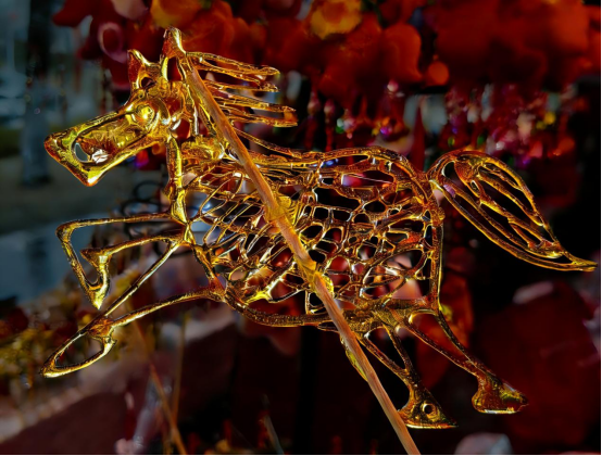 这枚以奔马为造型的“白马糖画”,它以糖为墨、以勺为笔,金黄透亮的糖丝勾勒出骏马御风疾驰的姿态,线条流畅如丝,筋骨力道尽显。作为泰州地区流传百年的非遗技艺,白马镇糖画主要流传于海陵区、姜堰区、高港区和泰兴市,如今更随着文旅融合的脚步,走进周边县市的民俗展演中。这枚奔马糖画既是可以入口的甜蜜小吃,也是承载美好期许的手工艺品,愿食之者日子甜甜蜜蜜。