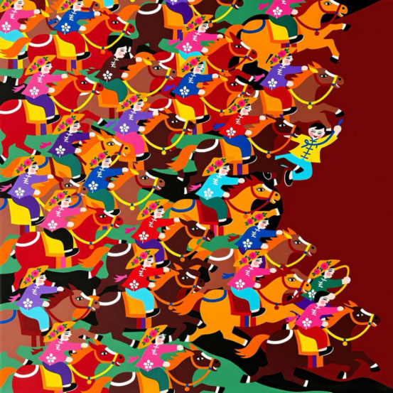 作品以民间农民画为载体,以浓烈饱满的色彩、质朴生动的造型,描绘了百骑奔腾的欢腾图景。斑斓的衣袂与骏马的色块交织成流动的锦绣,在赤红底色上掀起蓬勃的视觉浪潮。作品以乡野策马游春的民俗盛景为灵感,将传统年味转化为明快的视觉符号,既保留了民间艺术的鲜活张力,又以群像的动感传递出迎新春、庆丰年的炽热生命力,寄寓着福马踏新、生活红火的美好愿景。