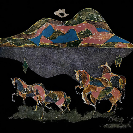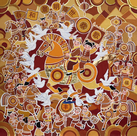 作品以暖橙、朱红铺展热烈底色,金箔勾勒出流动的几何纹理,让画面在明艳中更具层次。中心奔马昂扬勃发,白鸽振翅衔着春意穿梭,孩童们身着盛装载歌载舞。它以充满烟火气的民间艺术语言,将马年新春的欢腾、家国团圆的暖意融于一体,在鲜活的人物与明快的色彩里,传递出春和景明的盛世欢歌与真挚祝福。
