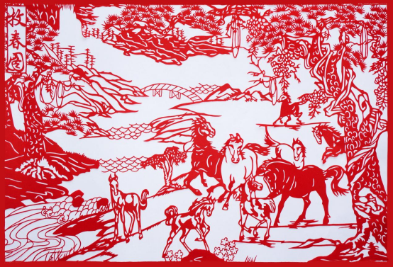 剪纸《牧春图》,取材于靖江——孙权牧马故地的悠远传说。这座古称马洲的城邑,“牧马大沙”的名号伴江风悠悠传千年。朱红线条勾勒旷野盛景:松涛起伏,溪流蜿蜒,孤山古桥隐于层林之间。骏马或昂首驰骋,或悠然伫立。一刀一剪皆藏匠心,将千年牧马场的壮阔、历史的厚重与春日的蓬勃生机,尽凝于方寸红纸之上。