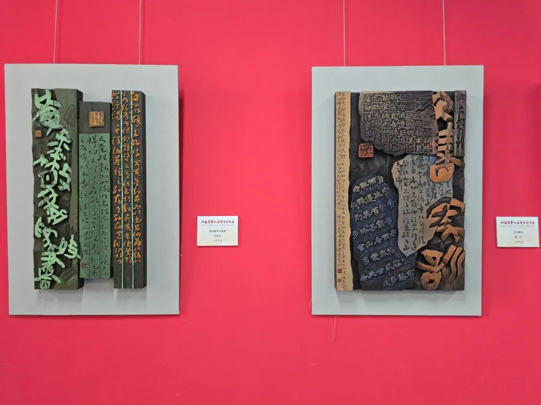 本次展览展出的是由江苏省书协重点打造的双年品牌“江苏省第九届刻字艺术展”部分作品。呈现出两大特征:一是“书刻同美”。作者以深厚的书法造诣为根基,通过刀法的刚柔相济与材质的自然肌理,既精准还原书法原作的笔墨神韵,又赋予其三维空间的立体美感;二是“书刻同风”。作品超越对书法原作的简单摹刻,在保持笔墨精神与刻痕韵味高度统一的基础上,通过构图重构、材质创新等艺术手法,使传统书法在载体转换中获得当代性的艺术升华。从质朴拙厚的汉简遗韵到简洁凝练的当代审美,刻字作品既保持“和而不同”的艺术理念,又通过色彩调和、形式创新展现时代特色。