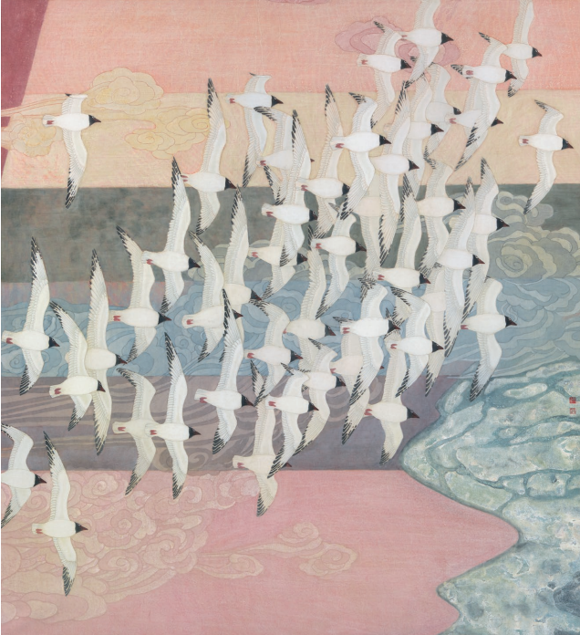 在中国画《生生不息》与《振翅凌云》中,磅礴的“鱼群”与“鸟群”的意象席卷纸面。我们仿佛能听到浪花随着鱼群奔腾的呼啸,也仿佛能感受到气流被羽翼扇动的鼓荡。这是一种对生命集体力量的礼赞,充满动感与野性。而在摄影作品《冬》里,一棵树孤独地伫立于满天风雪的中心,以细弱之躯对抗自然的狂暴。它在低语着生存的艰辛,更在宣告生命的坚韧。