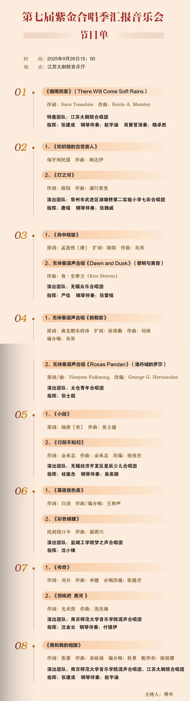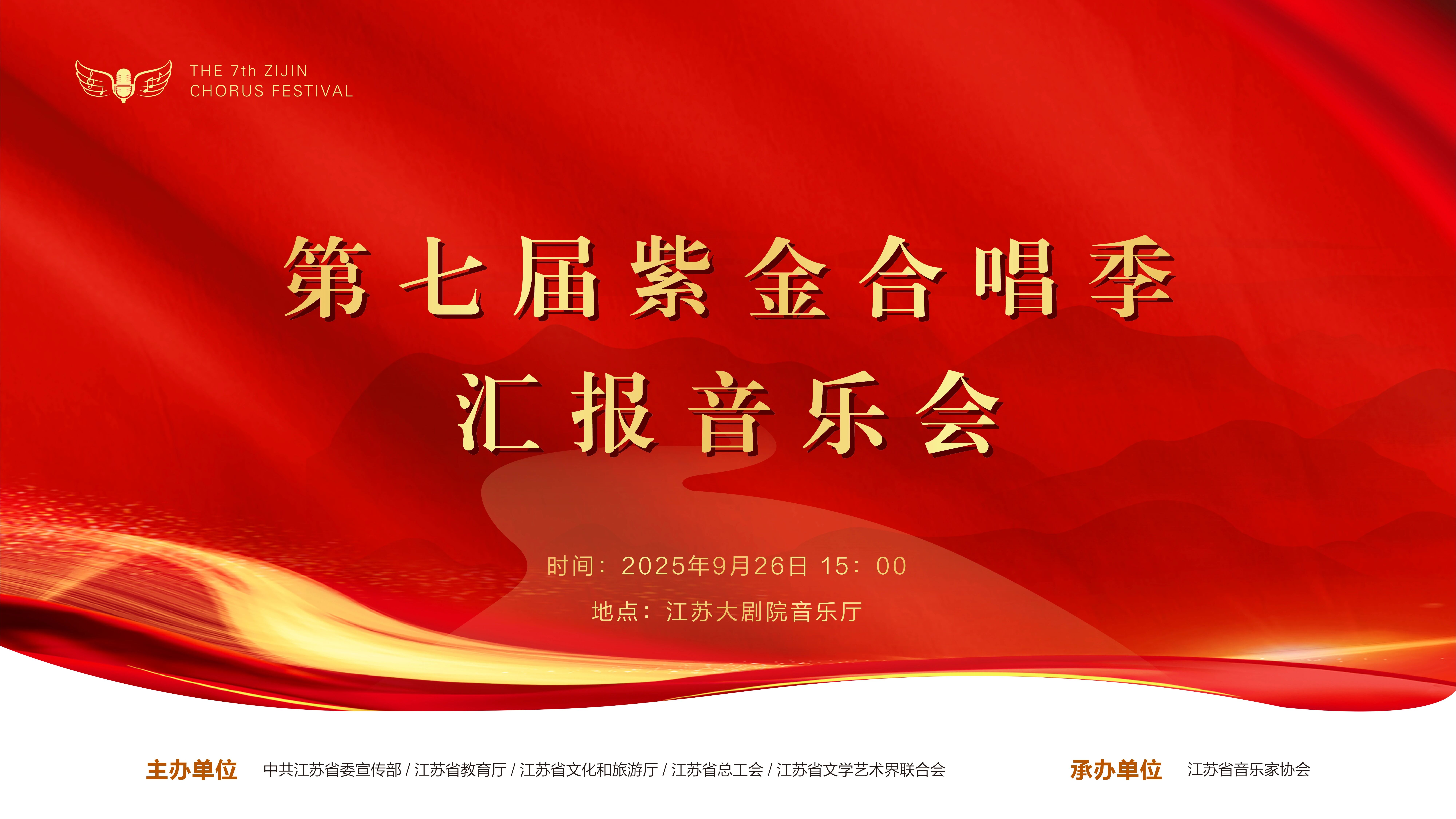 由中共江苏省委宣传部、江苏省教育厅、江苏省文化和旅游厅、江苏省总工会、江苏省文学艺术界联合会共同主办,江苏省音乐家协会承办的第七届紫金合唱季汇报音乐会将于9月26日15:00在江苏大剧院举办。