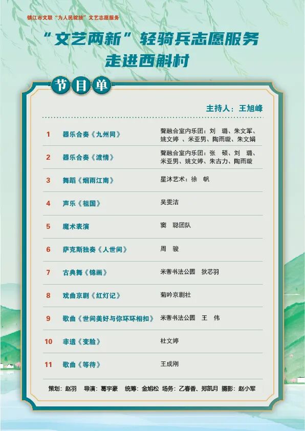 此次活动,是镇江市新文艺群体联合会深入学习贯彻习近平文化思想、落实市文联“为人民绽放”文艺志愿服务活动的具体行动,也是“文艺两新”扎根基层、服务群众的生动缩影。作为新时代文艺生力军,“文艺两新”群体始终牢记初心使命,主动担当社会责任,以文艺为桥、以服务为本,把优质文艺资源送到基层一线,把文化温暖送到群众心坎上,在服务人民中汲取创作养分,在扎根乡土中彰显价值担当,为丰富基层群众精神文化生活、推进乡村文化振兴注入源源不断的文艺活力。