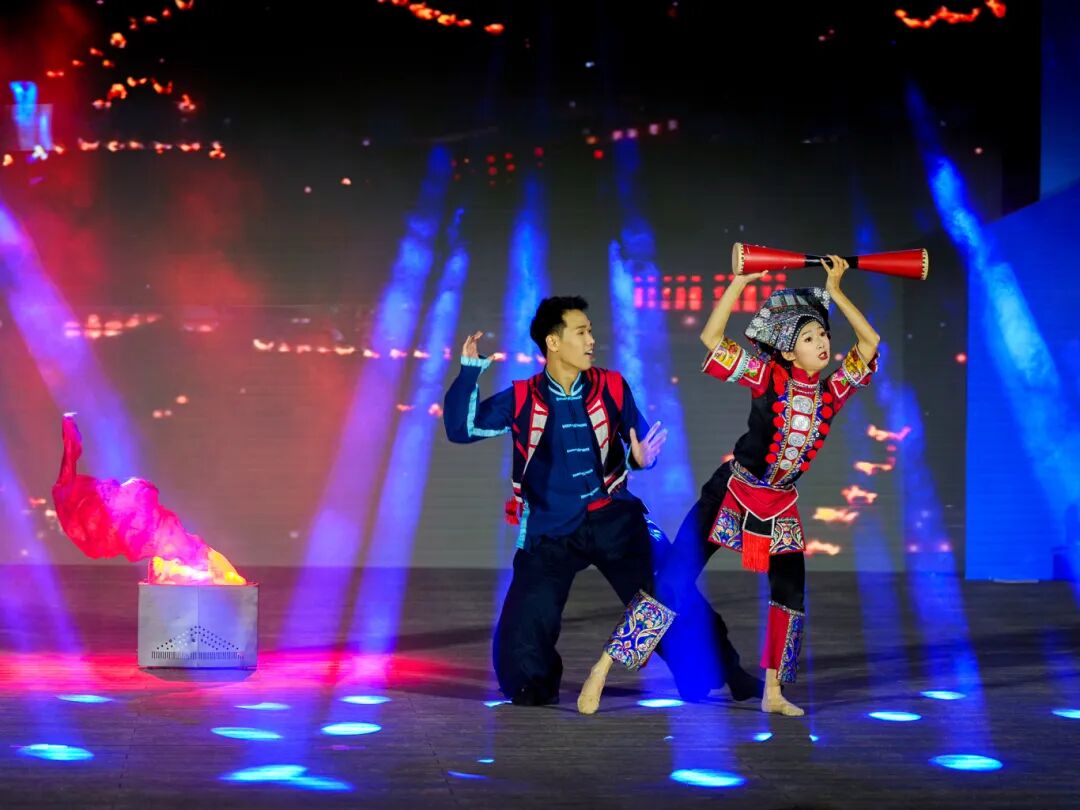 中南大学青年舞蹈家牛怡钒、朱子鹏以双人舞《夜话瑶山一双人》,将观众带入静谧的瑶山月色。他们以非遗长鼓为语汇,描绘出一幅乡村振兴的温暖图景,舞姿翩跹,情真意切。