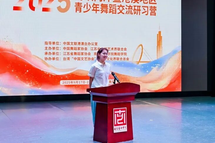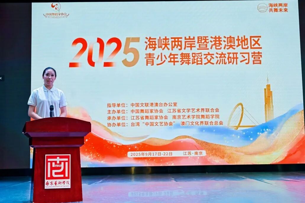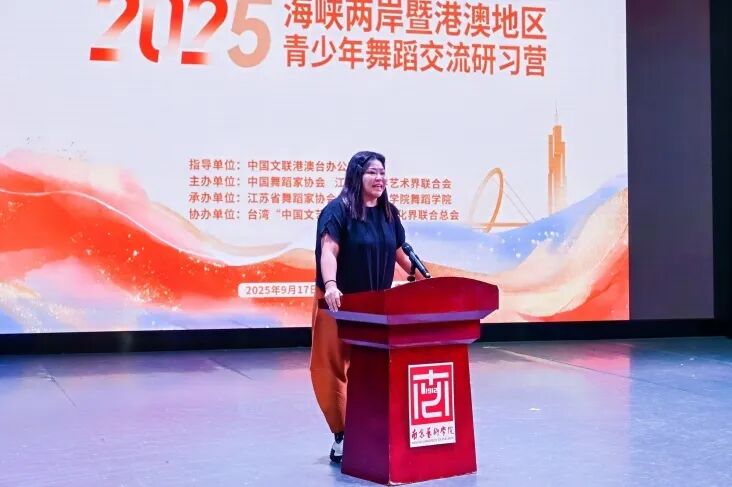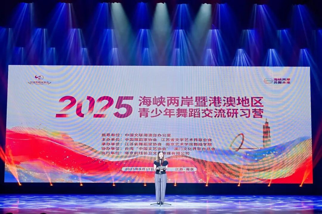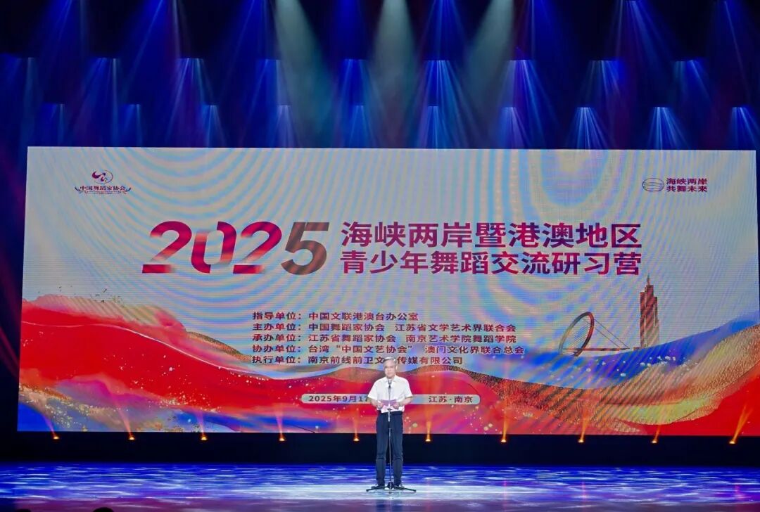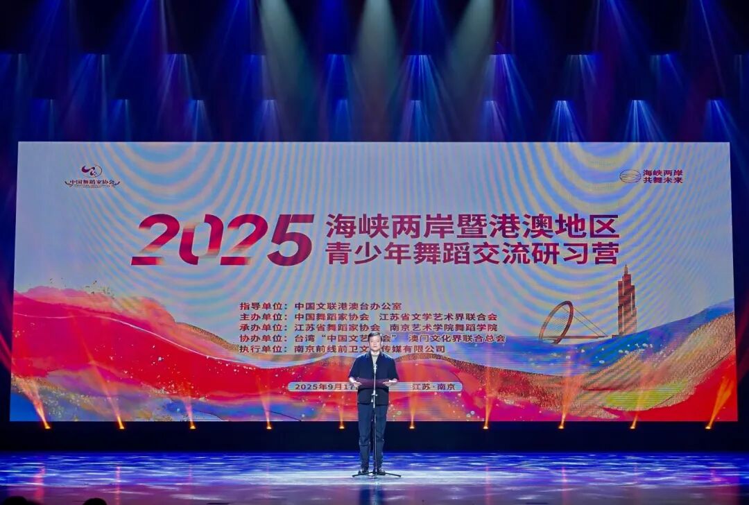 舞蹈是共同传承和弘扬中华文化的重要途径。9月18日晚,2025海峡两岸暨港澳地区青少年舞蹈交流研习营开幕式暨“海峡两岸共舞未来”主题演出活动在南京艺术学院南艺剧场举行,中国舞蹈家协会秘书长夏小虎,江苏省文联党组书记、副主席常胜梅,南京艺术学院党委书记俞锋,江苏省委台办二级巡视员余海,江苏省港澳办二级巡视员丁先忠,共青团江苏省委二级巡视员施静芝,江苏省文联二级巡视员韩军,台湾“中国文艺协会”理事暨舞蹈主任委员薛英娜,澳门文化界联合总会副会长郭英姿以及中国舞协、江苏省文联、南京艺术学院等相关领导及部门负责同志出席了开幕式。夏小虎、韩军、薛英娜、郭英姿分别致辞。