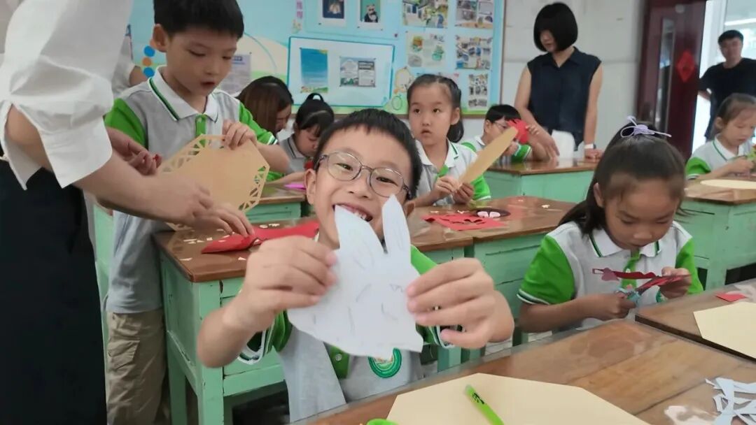 ▲在中秋节到来之际,镇江市民间文艺家协会走进镇江市中山路小学举办“纸间裁出中秋色,双师育就非遗心”中秋主题活动。