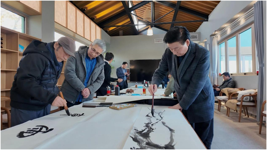 活动于12月5日下午在蒋坝湖畔人才会客厅正式拉开帷幕,涵盖书画辅导和专题讲座两大环节。书画创作区墨香四溢,艺术家们挥毫泼墨,与当地书画爱好者亲切交流,一幅幅生动传神的书画作品在笔尖流淌而出;专题讲座区座无虚席,主讲人季蒙蒙以《关于艺术赋能乡村的实践》为题,用生动的案例和深入浅出的讲解,让在场的美学爱好者、院子主理人和村民代表深受启发。现场互动频繁,艺术理论与乡村实践在此完美交融。