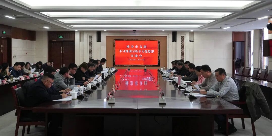 ▲日前,淮安市文联在市行政中心会议中心召开学习贯彻习近平文化思想交流会。会议强调,要坚持以党的创新理论武装头脑、指导实践、推动工作,更好地谋划“十五五”工作思路和2026年重点工作,确保“十五五”文艺文联工作开好局、起好步。