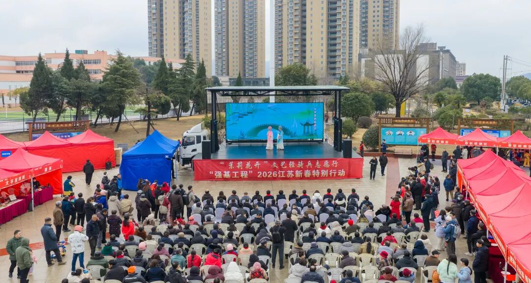 1月31日上午,镇江句容市下蜀镇法治文化广场上张灯结彩、热闹非凡、年味浓郁,“茉莉花开”文艺轻骑兵志愿行——“强基工程”2026江苏新春特别行动在这里启动。