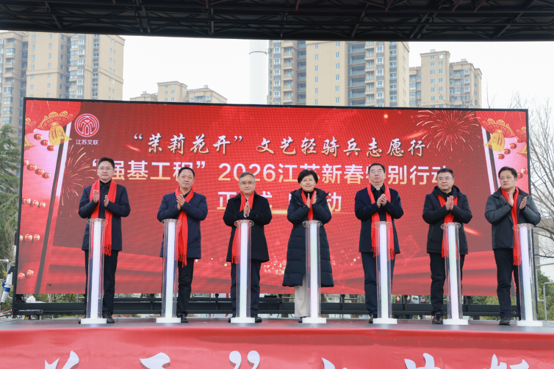 常胜梅、武鸣、韩军、郑泽云、王德家、胡光亮、陈斌共同启动“茉莉花开”文艺轻骑兵志愿行——“强基工程”2026江苏新春特别行动。本次新春特别行动构建省、市、县、乡四级联动格局,组织广大文艺工作者走进基层、深入群众,通过展览展示、文艺汇演、公益讲座、送春联写福字、公教等近500场形式多样的文艺活动,把新春的温暖和文艺的馨香播撒在基层大地。