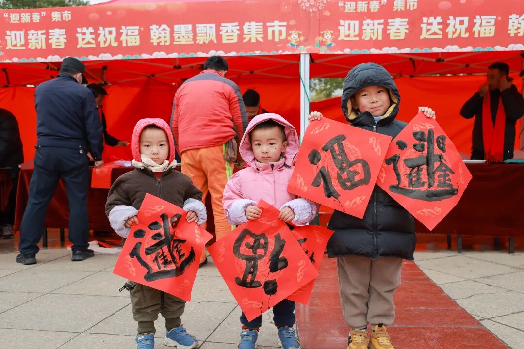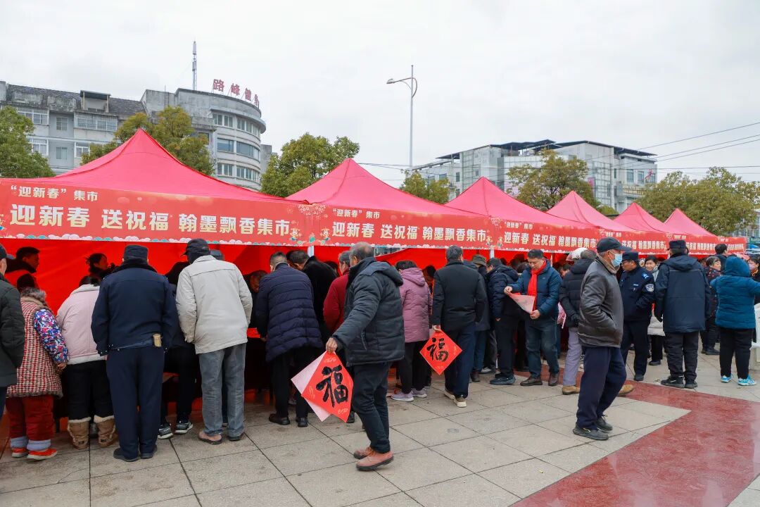 现场的“迎新春”集市上,人头攒动,气氛热烈,欢声笑语不断。十三位书法志愿者现场挥毫,书写春联和“福”字,将新春的美好期许凝于笔端。接过春联和“福”字的群众脸上洋溢着幸福的笑容,直呼这是最贴心的新春祝福。