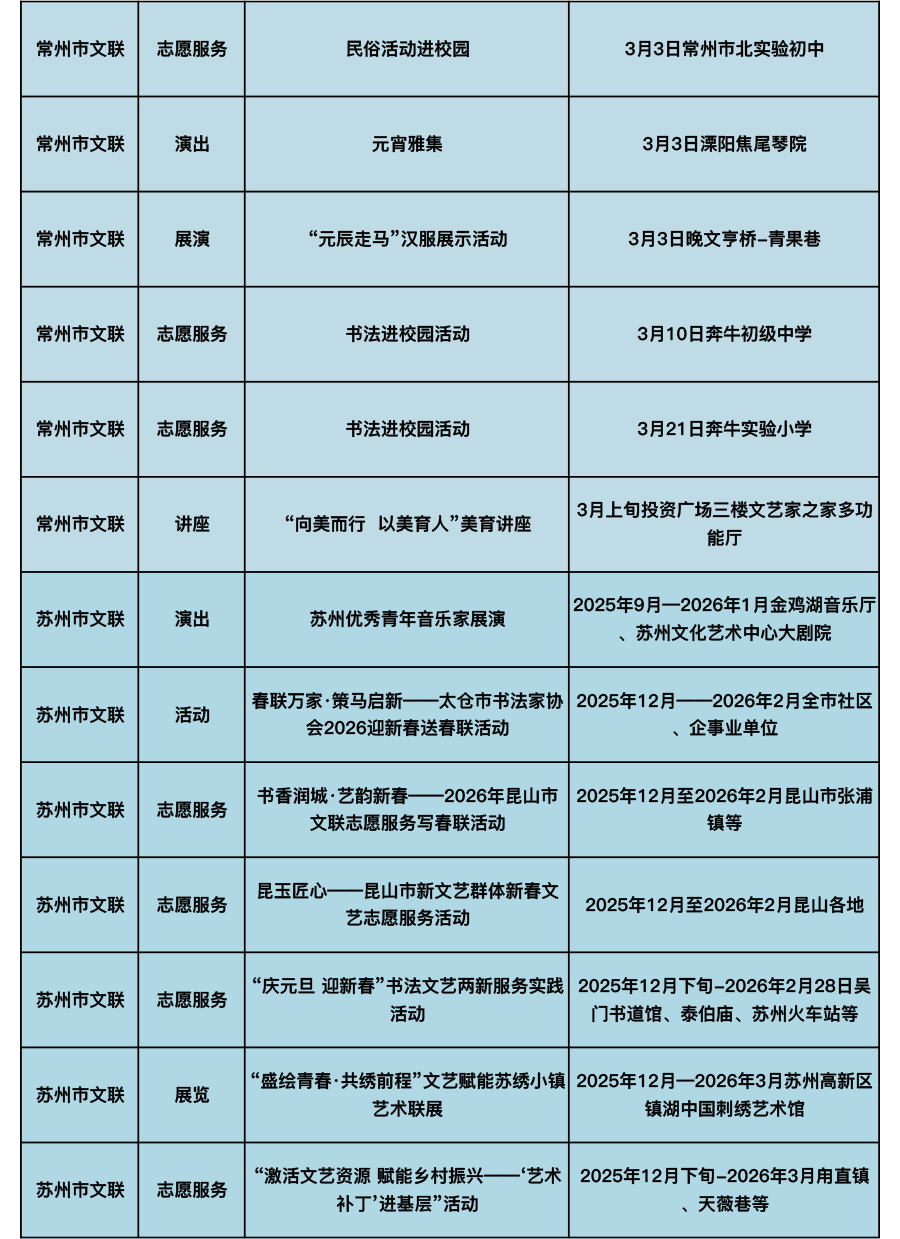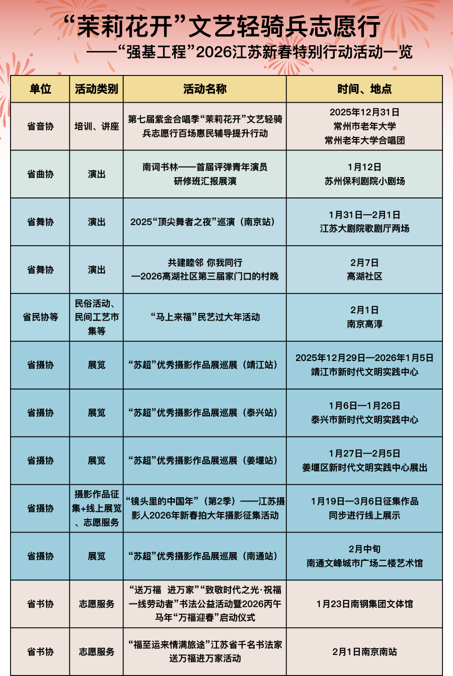 “茉莉花开”文艺轻骑兵志愿行——“强基工程”2026江苏新春特别行动已于1月31日正式启动。本次新春特别行动以 “强基工程” 为抓手,将优质文艺资源精准下沉基层,丰富群众节日文化生活,增强文化获得感与幸福感,营造喜庆祥和的新春氛围,推动文艺助力基层精神文明建设行动走深走实。