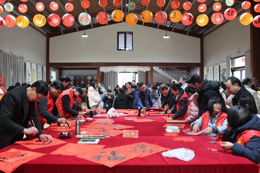 扬中市文联组织文艺志愿者在现场义务写春联、送福字、剪彩纸、演节目,将书法、剪纸、戏曲等传统文化送到基层,让村民在家门口尽享新春文化盛宴。