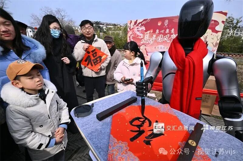 2026年2月1日,南京江北新区汤泉街道,机器人现场书写“福”字送给市民。刘明 摄