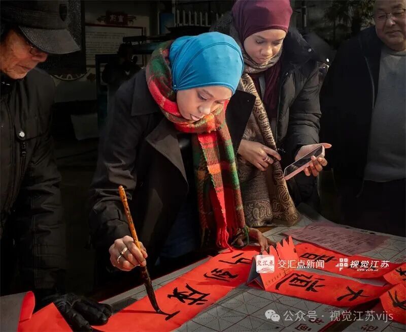 2026年2月7日,扬州市邗江区沿湖村,外国友人体验写春联,感受中国年俗文化。魏群 摄