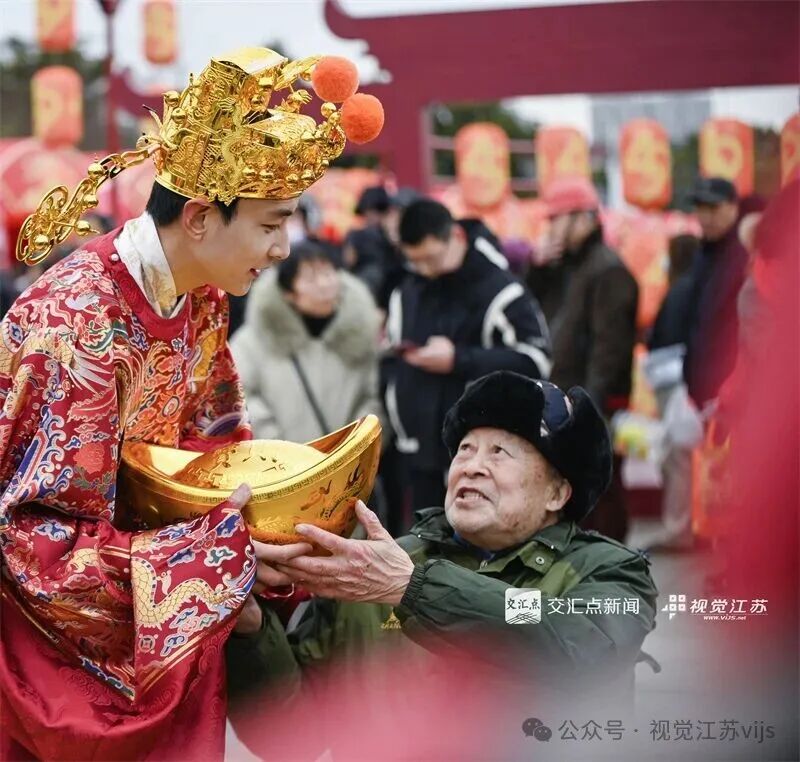 2026年2月7日,镇江市,恒顺“打酱油”大集启动,一位老先生开心地从“财神”手里接过元宝。贾骏 摄