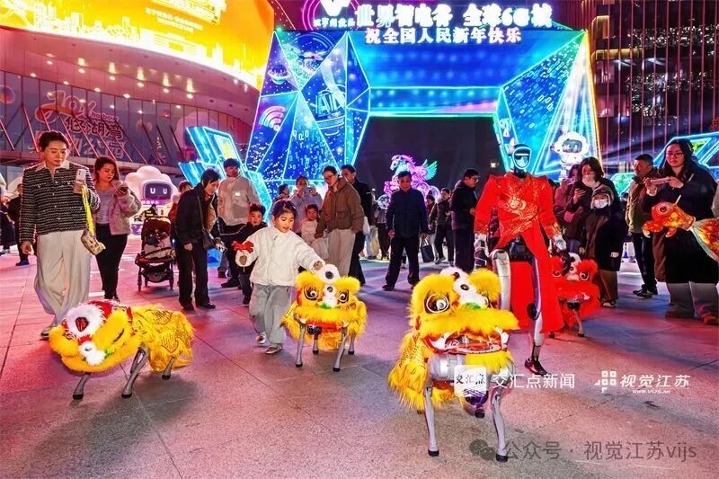 2026年2月1日,第二届新春年货供销大集暨广电十一届年货嘉年华在南通环西文化广场举行。图为萌娃和机器幼狮。顾炳泉 摄