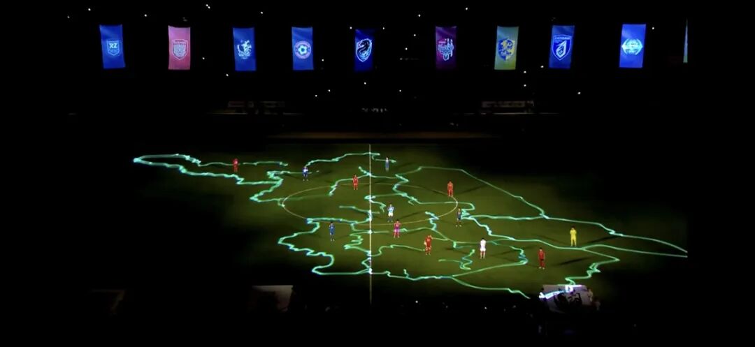激光灯勾勒江苏地图的灵感,源于“苏大强”每个城市聚是一团火,散是满天星,以激光为笔、以夜空为卷,极简线条勾勒出江苏版图,大胆色块区分13城坐标。再配合13架无人机搭载软屏展示各城队徽,直接将排面拉满。