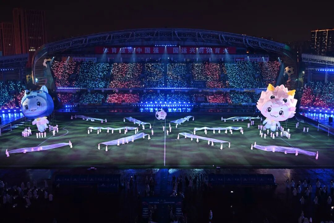 科技保障同样历经考验。开场前15分钟,13块无人机屏,其中1块突然花屏,团队临危不乱,紧急启用备用屏,最终让十三座城市足球队的队徽在夜空中稳稳闪耀。
