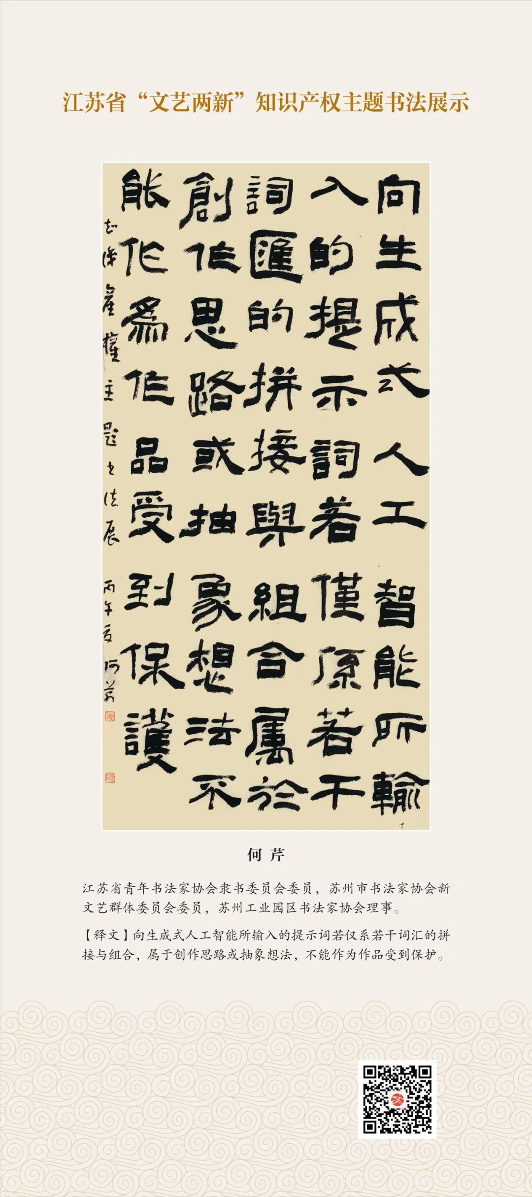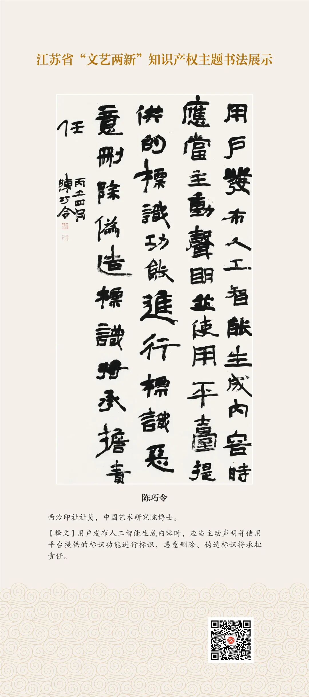 展览以人工智能时代艺术作品权益保护为主题,特邀我省30位“文艺两新”书法家,围绕核心普法内容精心创作30件主题作品。作品以楷、行、隶书为主,笔法端雅沉稳、结体清朗谨严,既见传统笔墨的深厚功底,更兼普法传播的实用实效。点画之间,融法治精神于翰墨;横竖之中,载版权理念于纸端,以传统艺术之美,启全民普法之思。