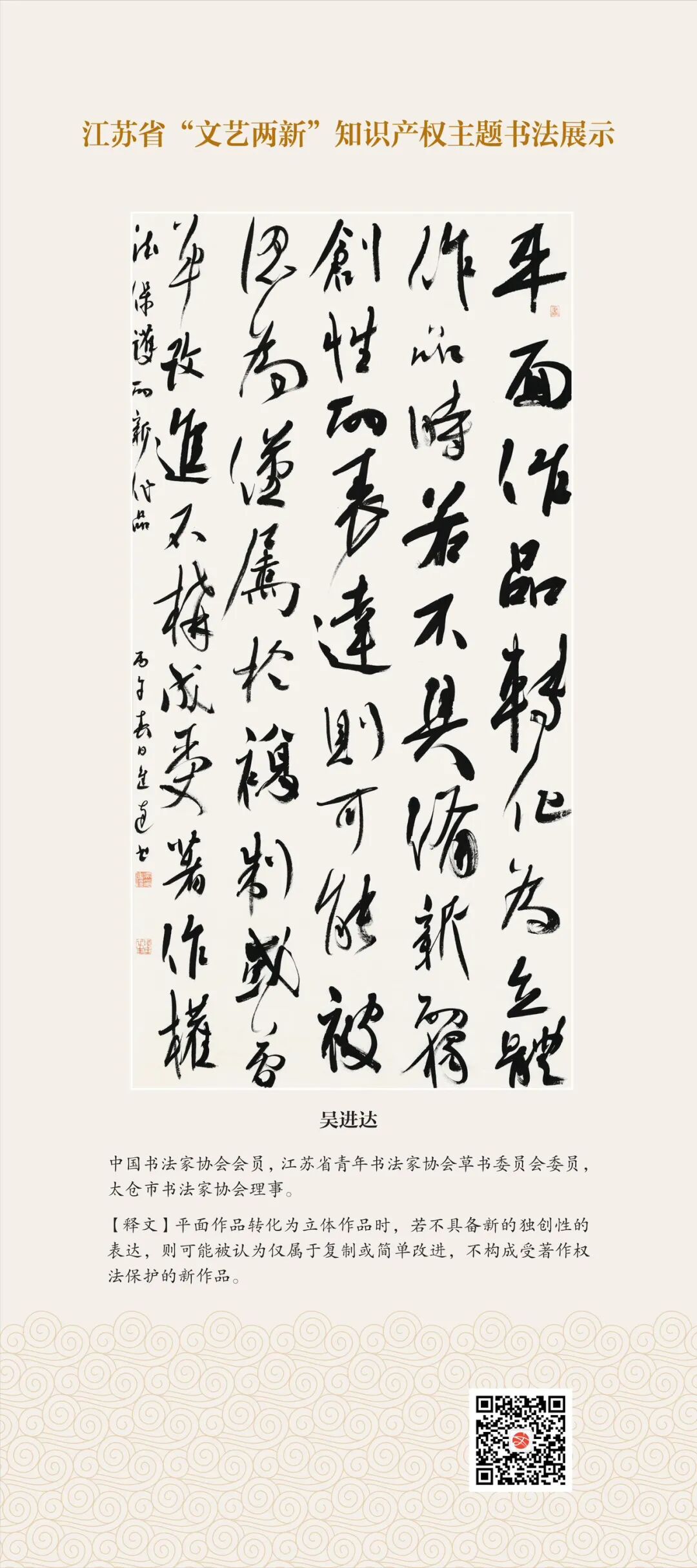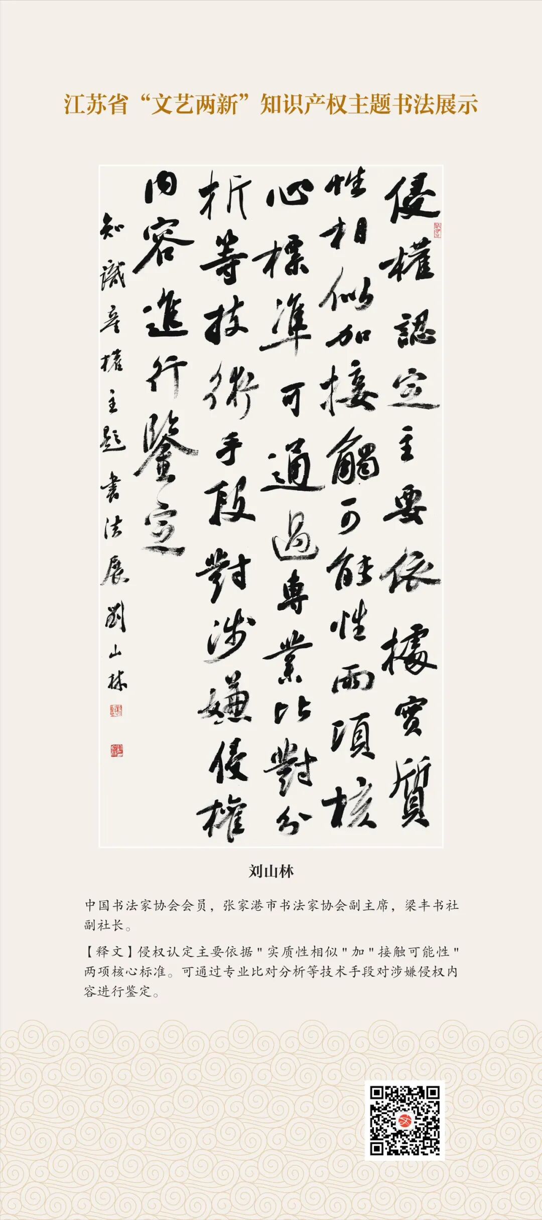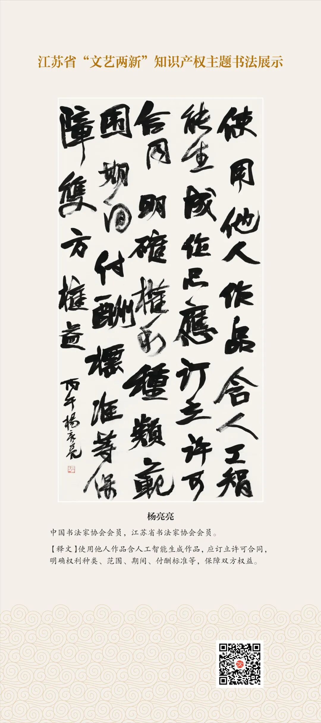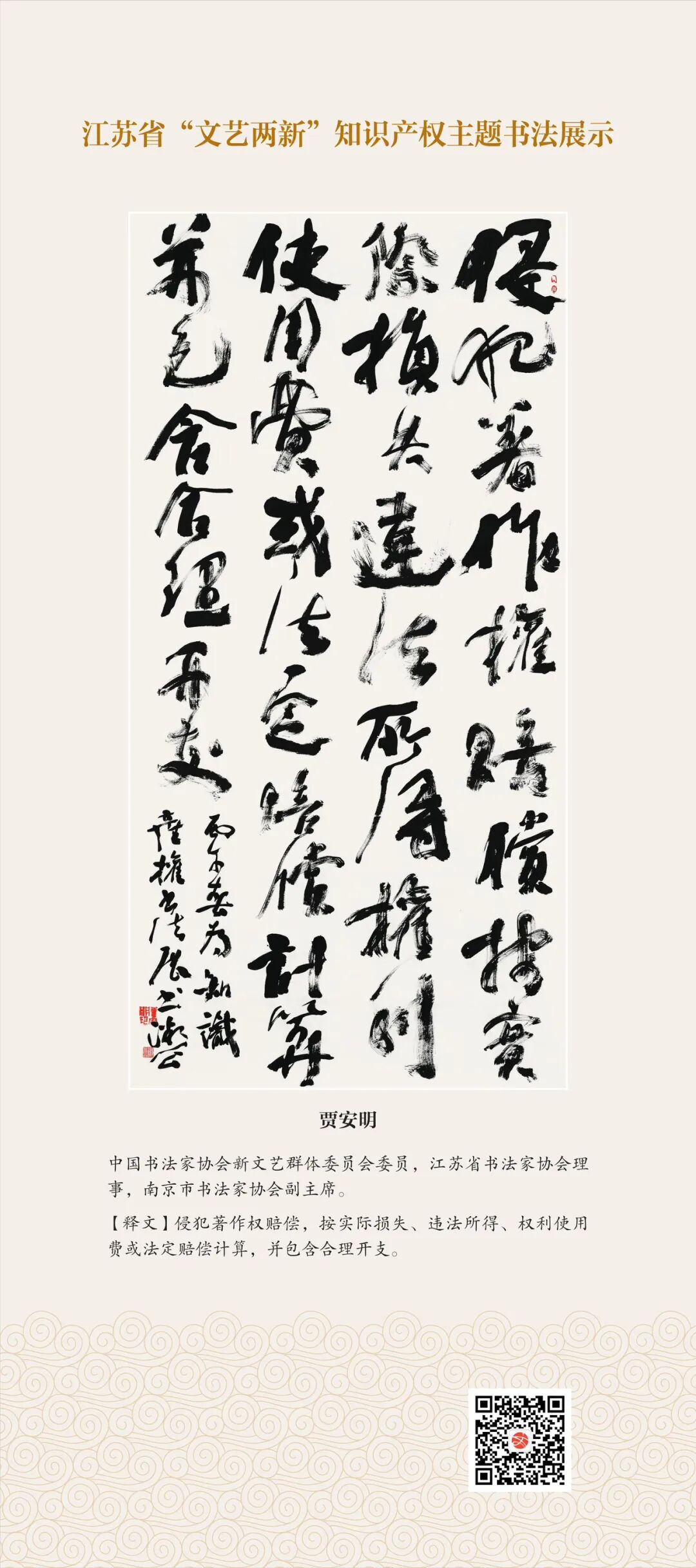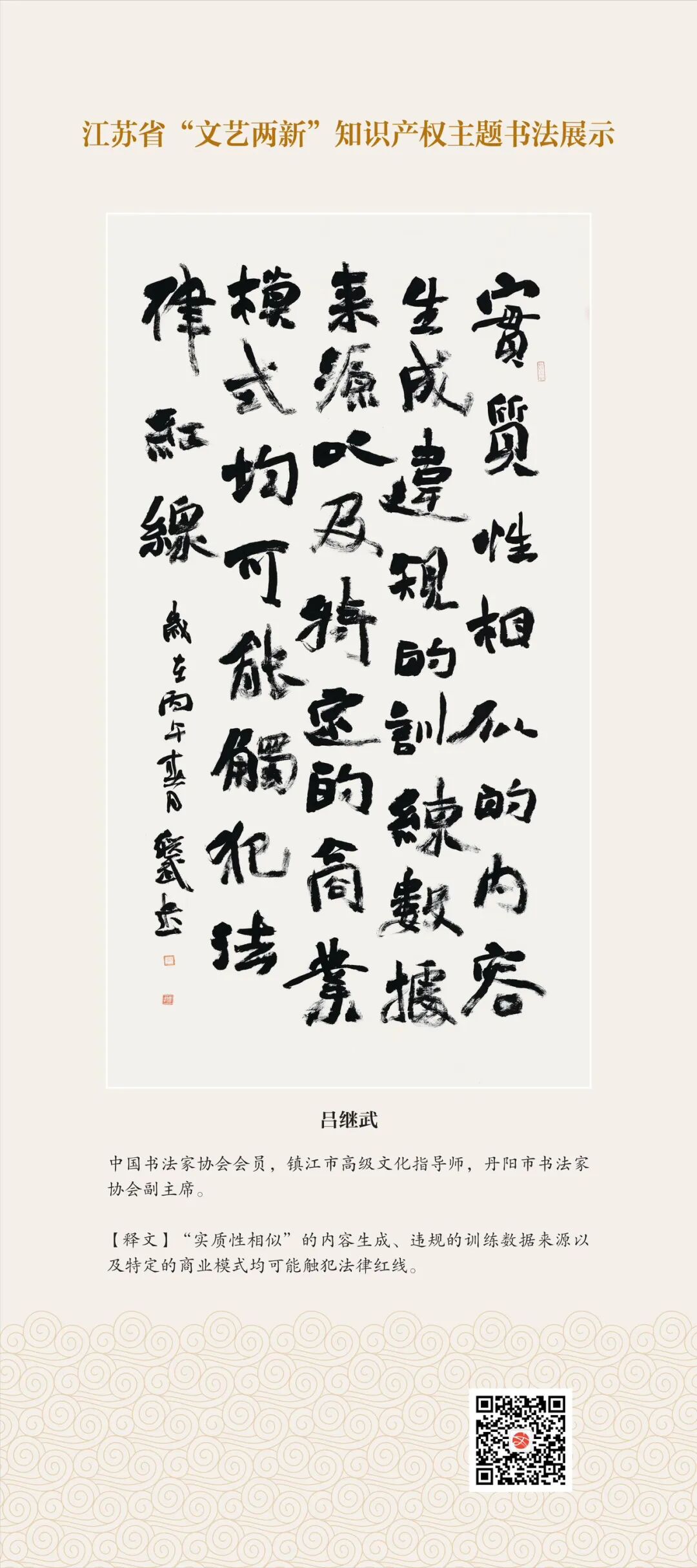 此次展示,是全省文联系统深入贯彻习近平文化思想、习近平法治思想的生动实践,是落实中国文联2026年知识产权宣传周部署、推进“文艺两新”工作高质量发展的创新举措。活动立足省级“文艺两新”实践基地,探索“法治+艺术”融合新路径,延伸服务触角、强化维权引领,让文艺初心与法治精神同频共振,在赏墨韵之美中,普及知识产权理念,提升权益保护意识,共筑尊重原创、守护创新的良好生态,为江苏文化强省建设注入源源不竭的法治正能量。