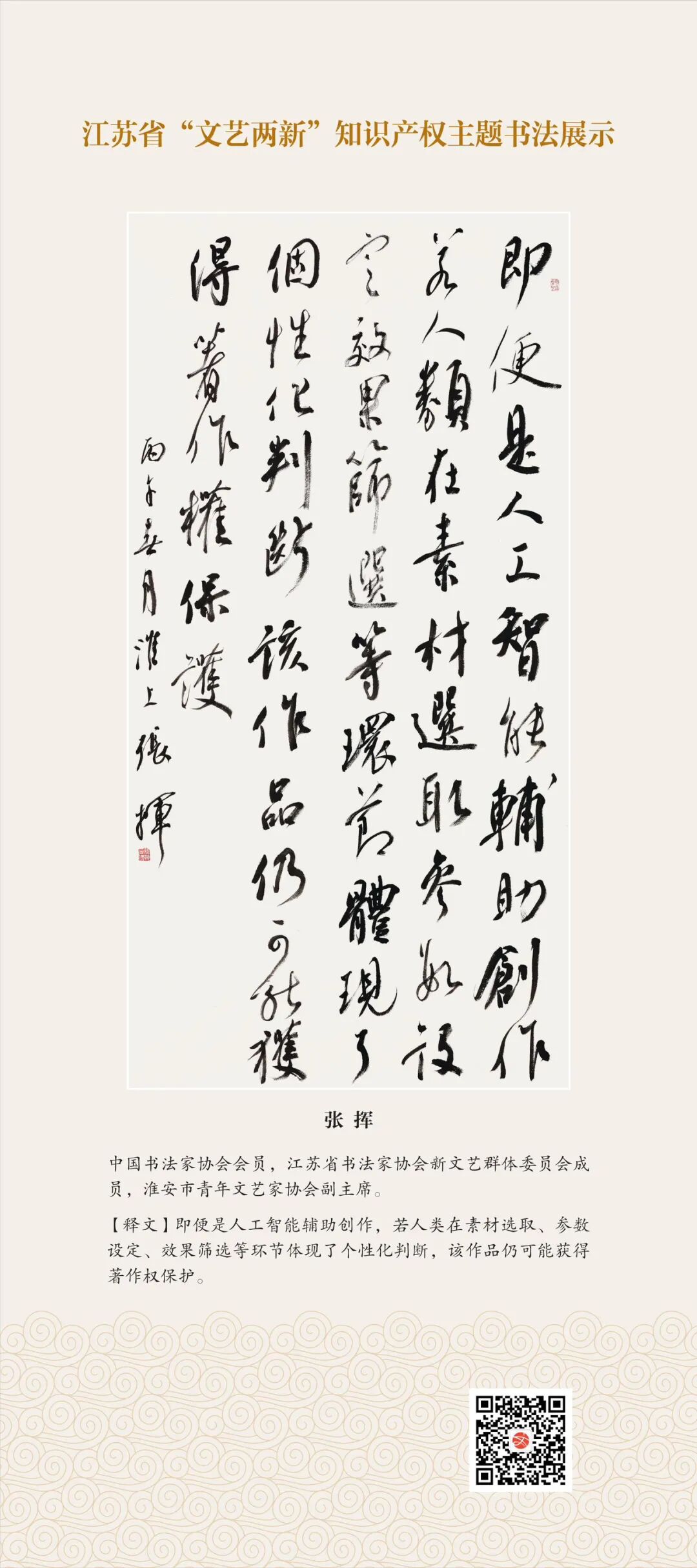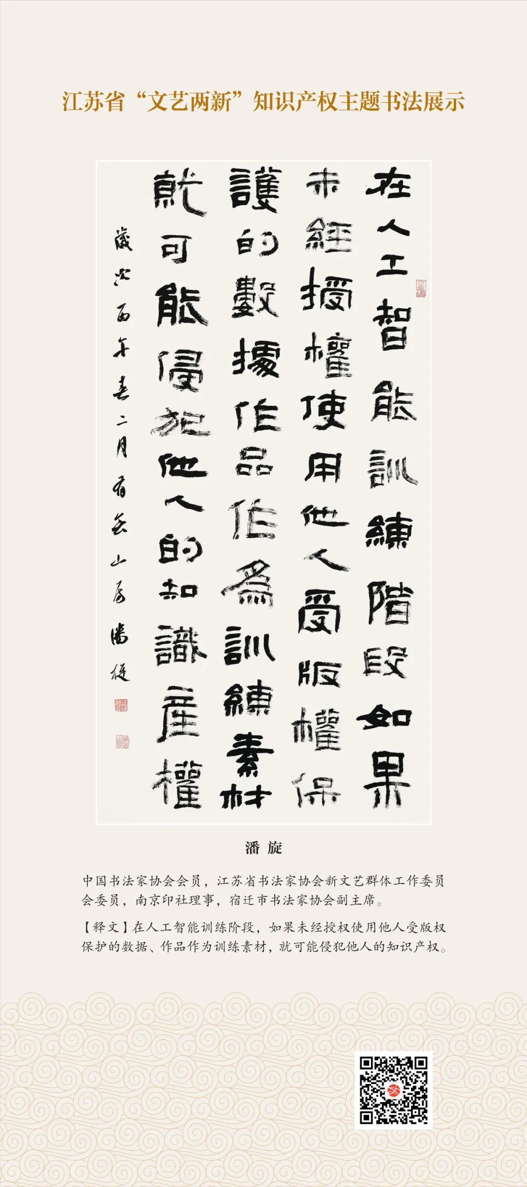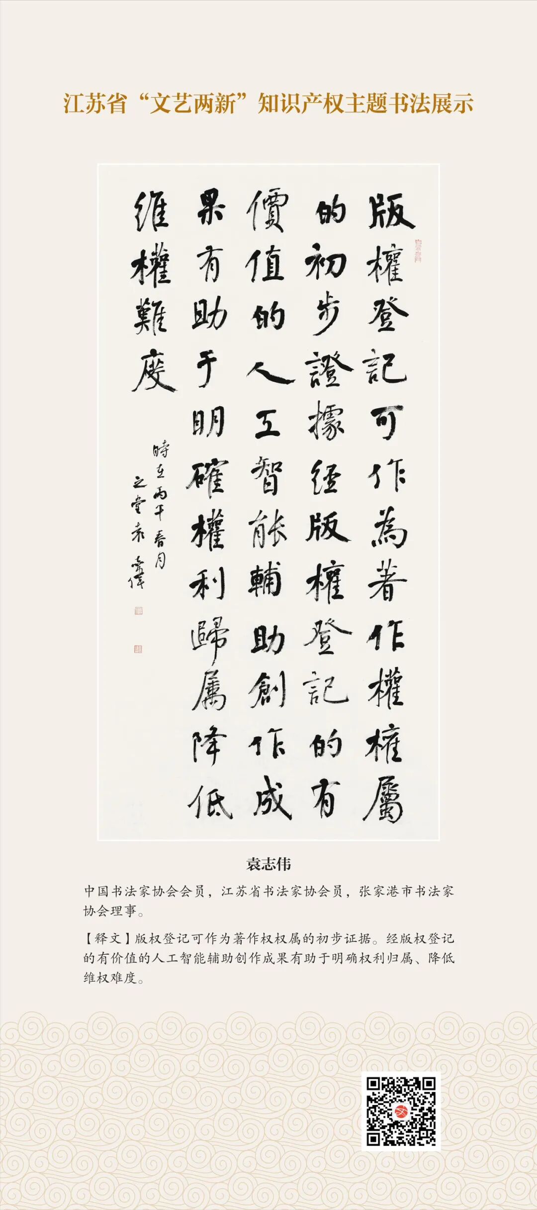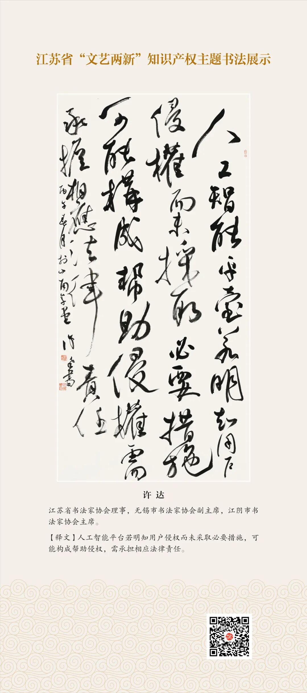 此次展示,是全省文联系统深入贯彻习近平文化思想、习近平法治思想的生动实践,是落实中国文联2026年知识产权宣传周部署、推进“文艺两新”工作高质量发展的创新举措。活动立足省级“文艺两新”实践基地,探索“法治+艺术”融合新路径,延伸服务触角、强化维权引领,让文艺初心与法治精神同频共振,在赏墨韵之美中,普及知识产权理念,提升权益保护意识,共筑尊重原创、守护创新的良好生态,为江苏文化强省建设注入源源不竭的法治正能量。