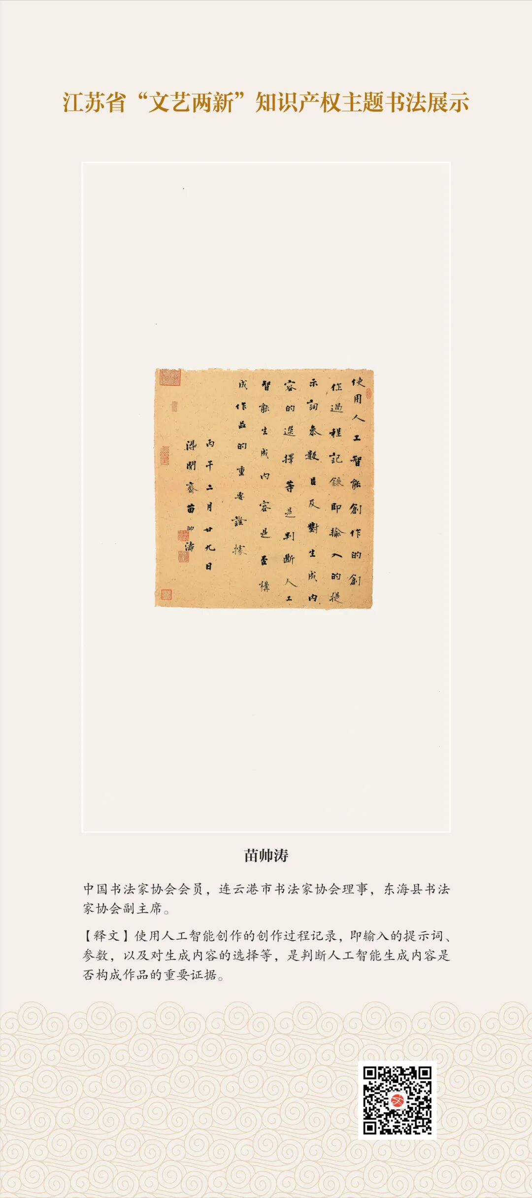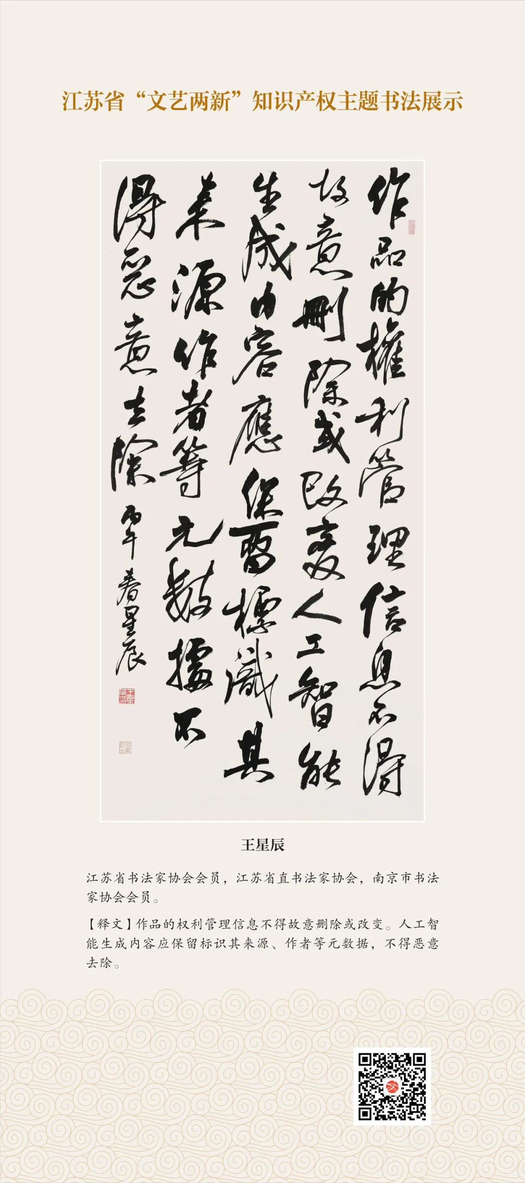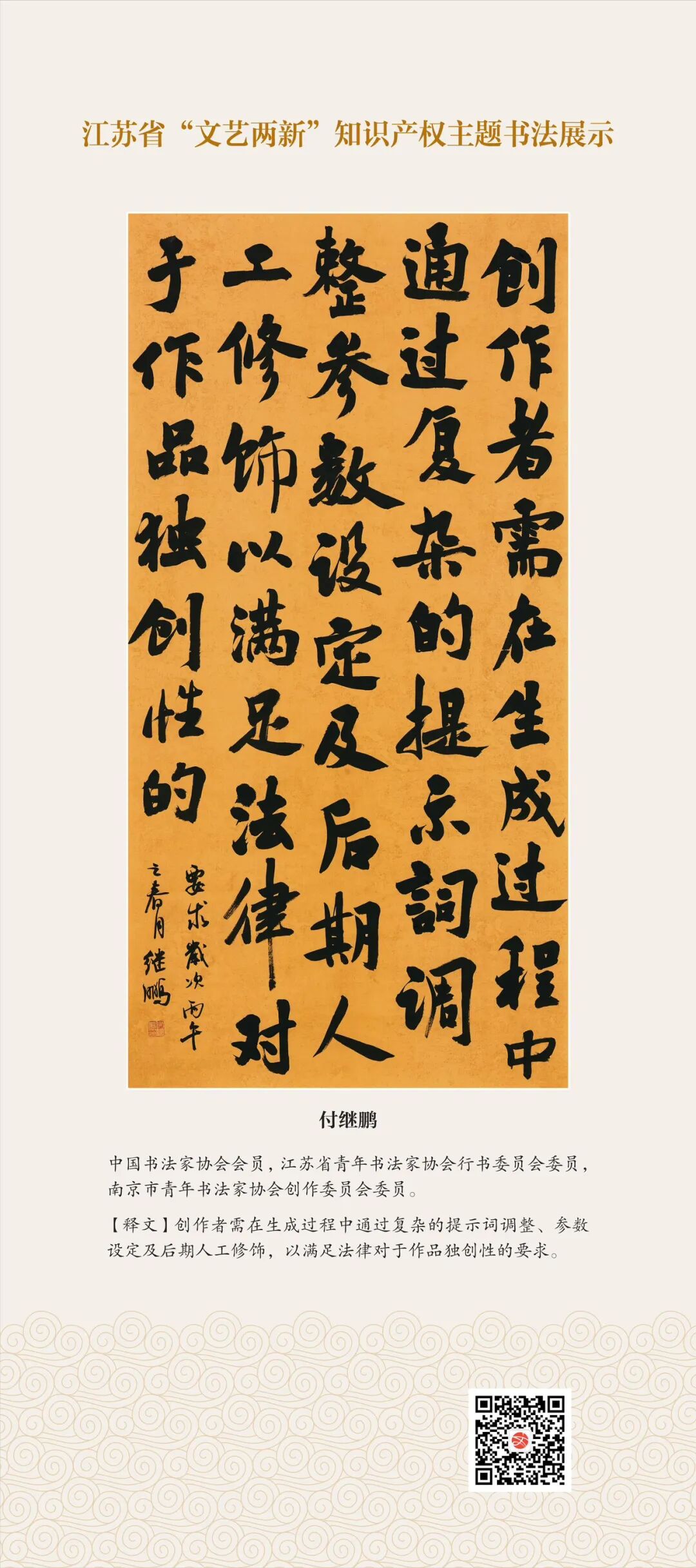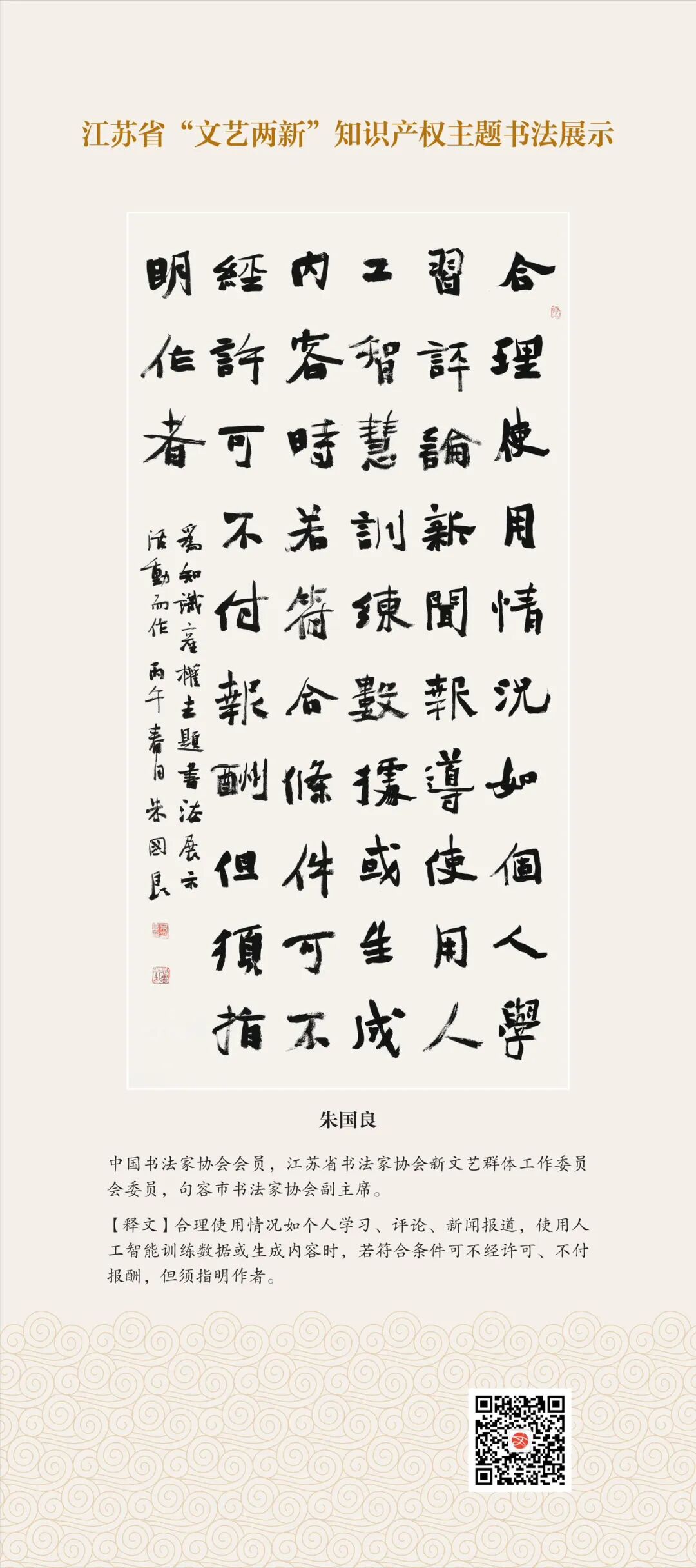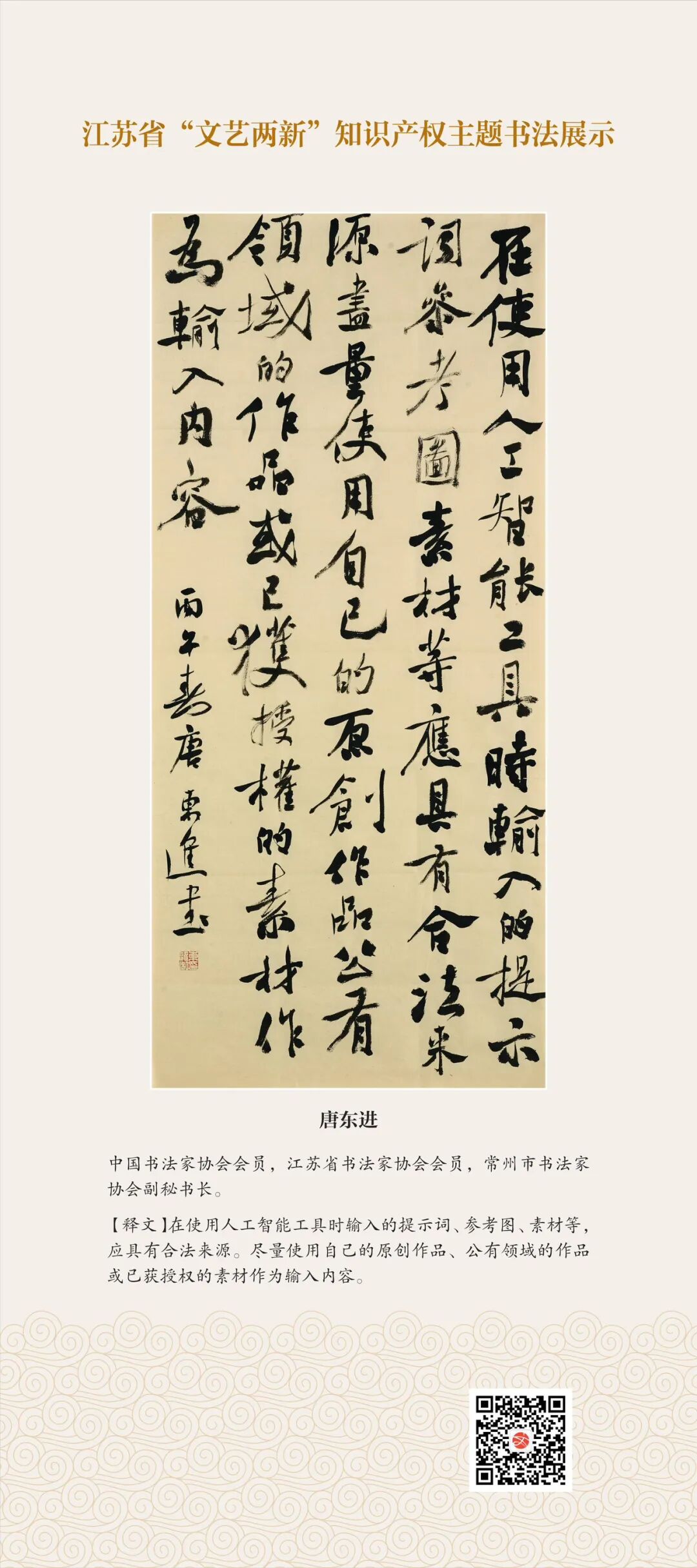 此次展示,是全省文联系统深入贯彻习近平文化思想、习近平法治思想的生动实践,是落实中国文联2026年知识产权宣传周部署、推进“文艺两新”工作高质量发展的创新举措。活动立足省级“文艺两新”实践基地,探索“法治+艺术”融合新路径,延伸服务触角、强化维权引领,让文艺初心与法治精神同频共振,在赏墨韵之美中,普及知识产权理念,提升权益保护意识,共筑尊重原创、守护创新的良好生态,为江苏文化强省建设注入源源不竭的法治正能量。